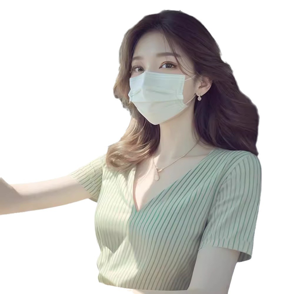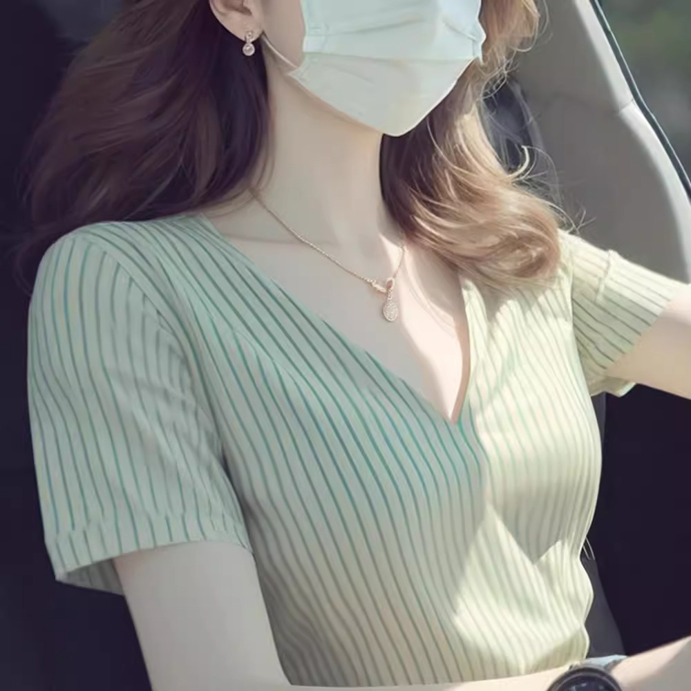 新款爆款绝美短款上衣条纹显瘦正肩雪纺冰丝短袖t恤女款夏季