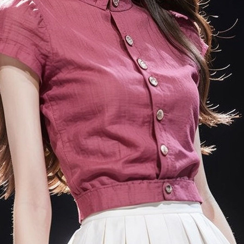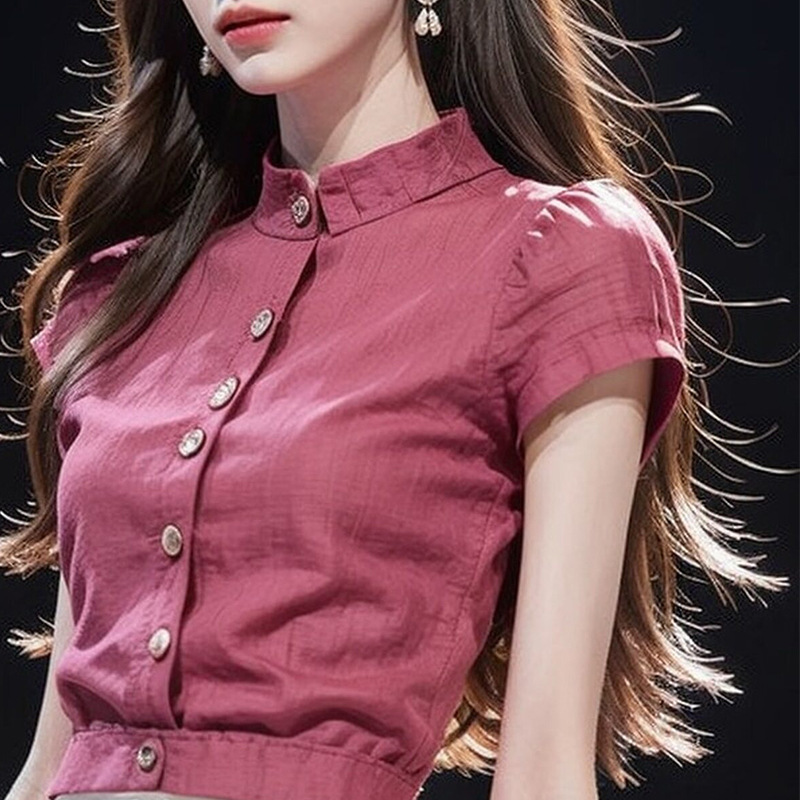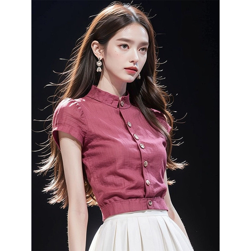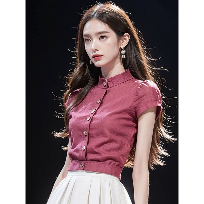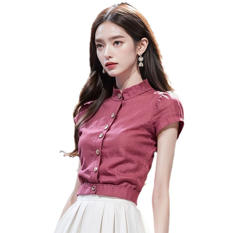 新款女轻奢高级感衬衫轻熟法式小众气质玫红色短袖收腰上衣夏