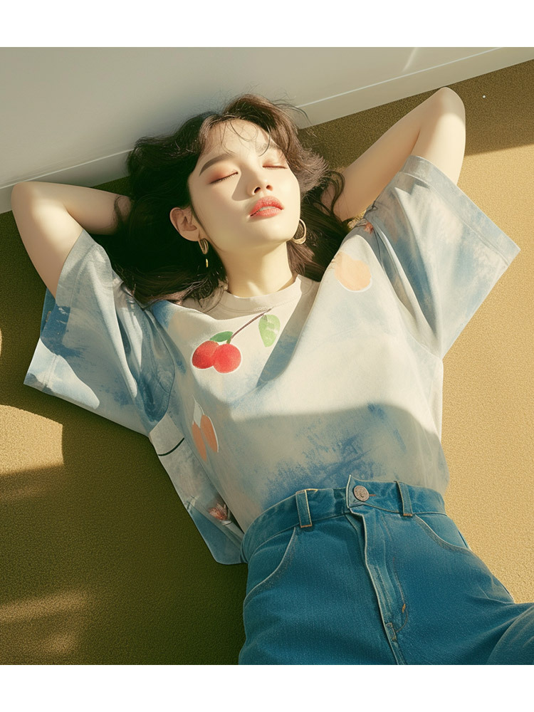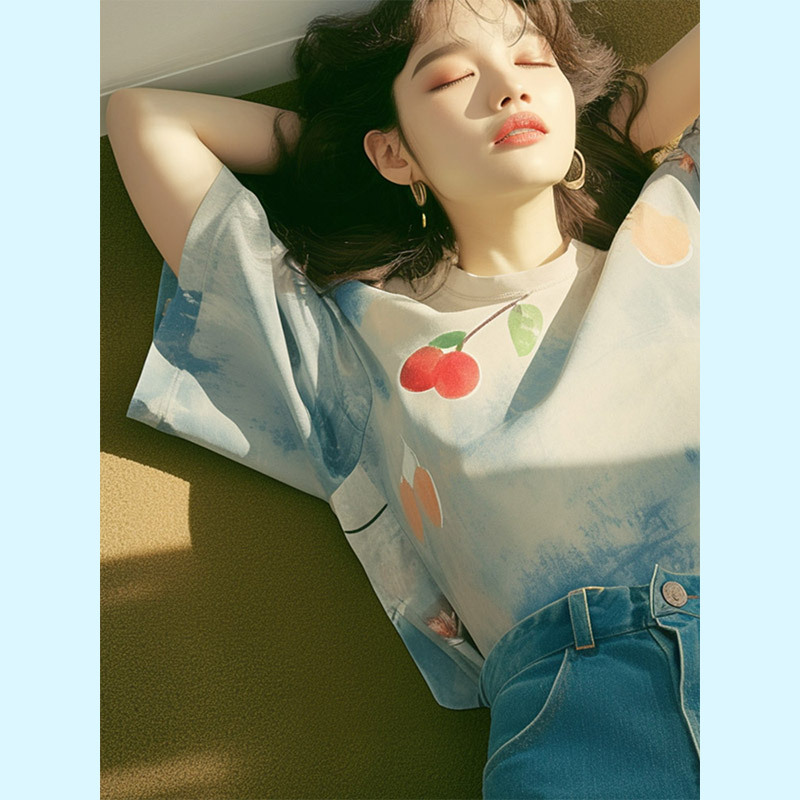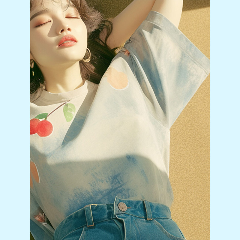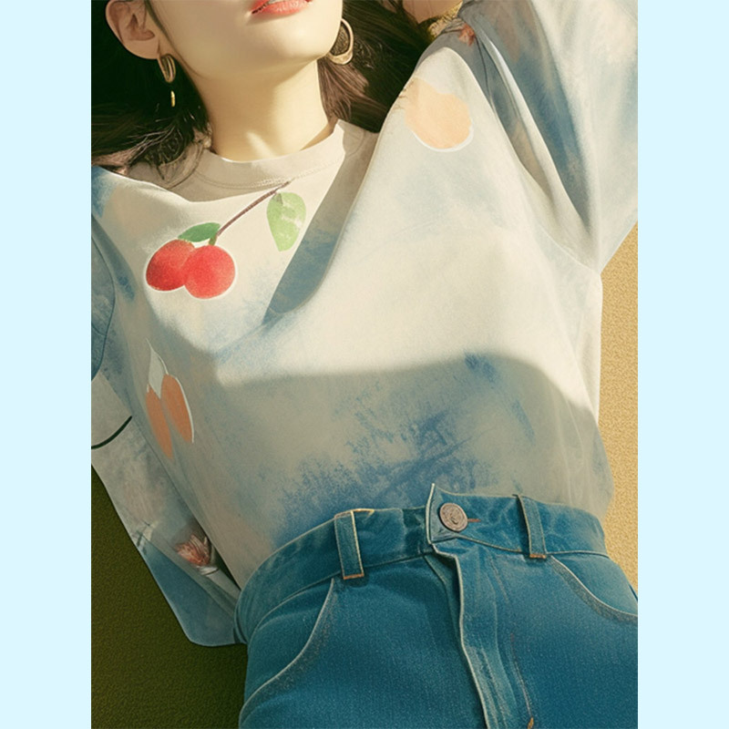 时髦时尚洋气蓝色樱桃印花t恤女新款小众别致韩系chic小上衣