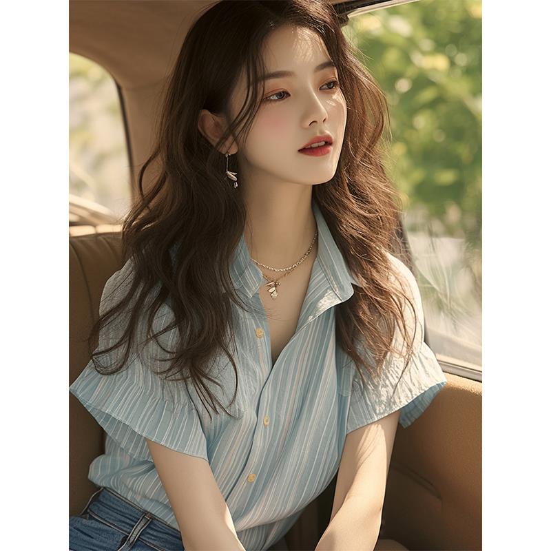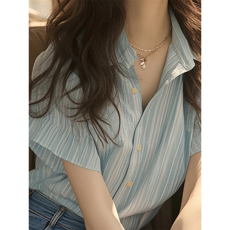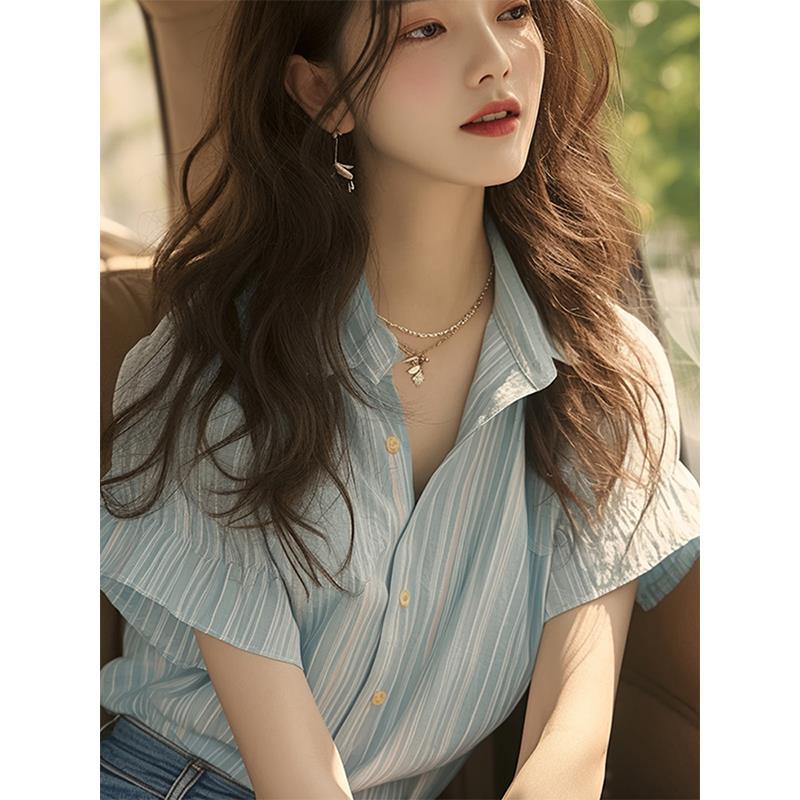 法式高级感蓝色条纹短袖衬衫今年流行漂亮小衫独特别致上衣女夏装