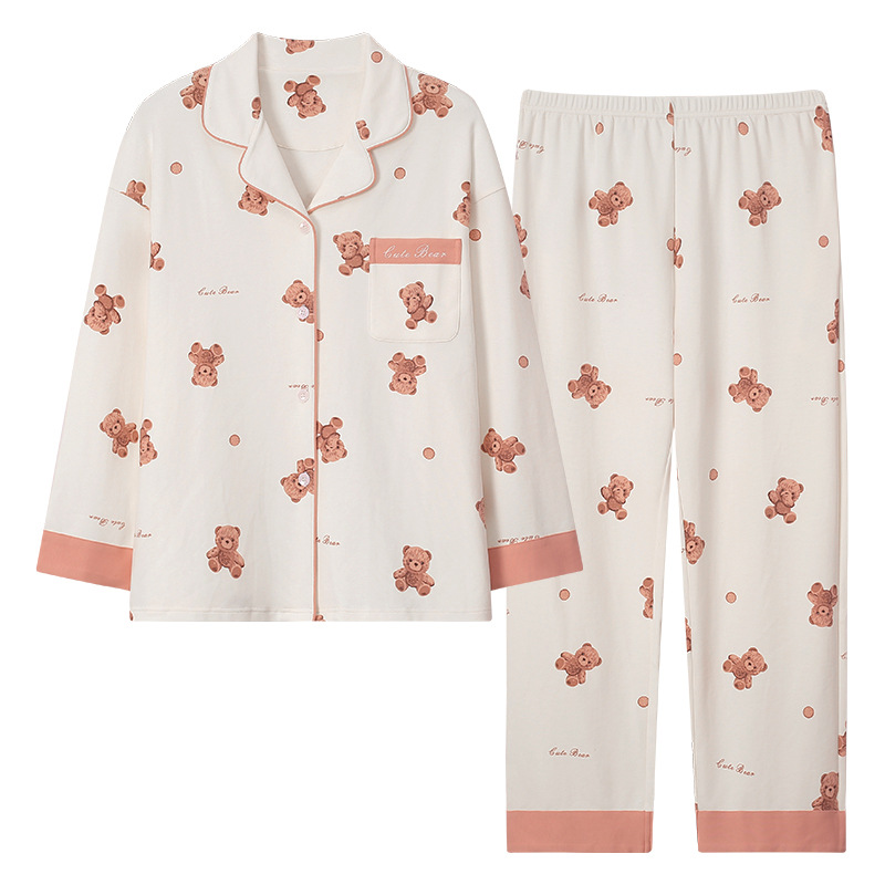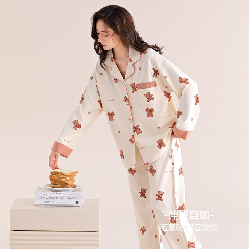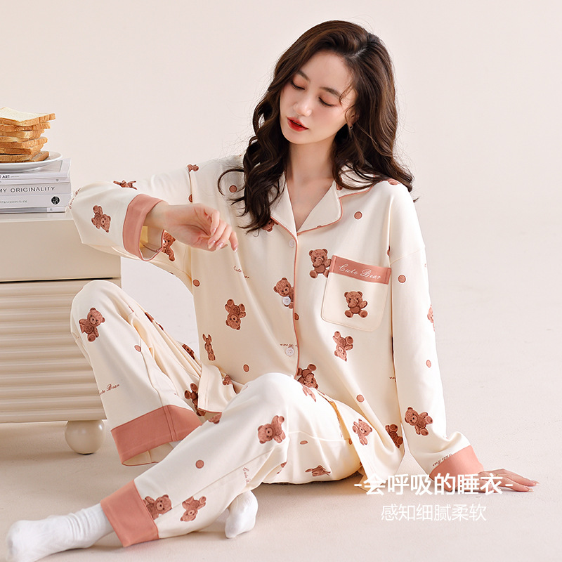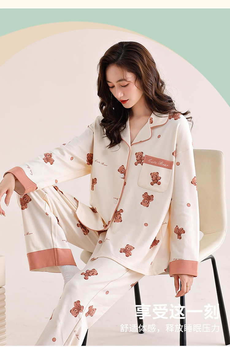 纯棉睡衣女士春秋季薄款长袖甜美开衫秋天外穿翻领大码家居服套装