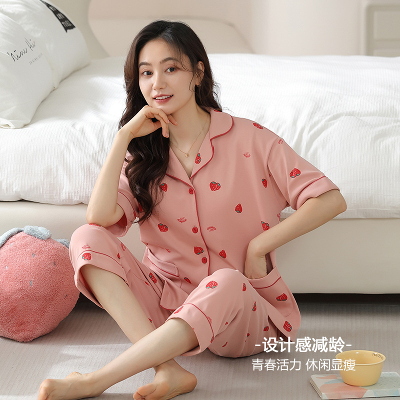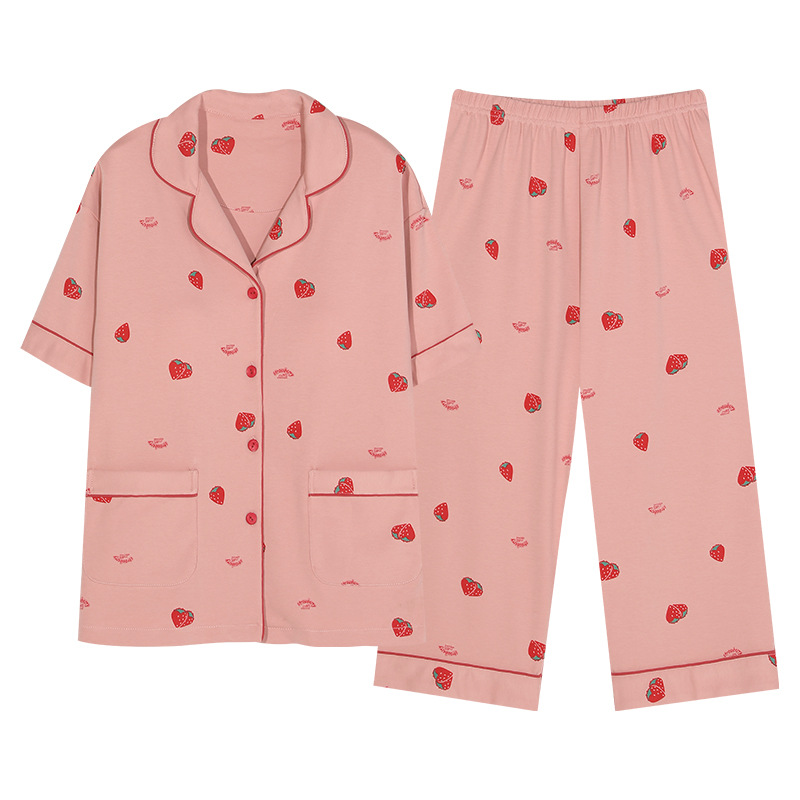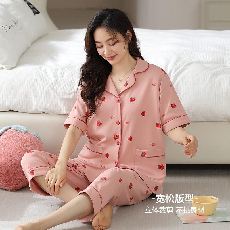 纯棉睡衣女夏季短袖七分裤甜美卡通开衫宽松大码家居服年新款