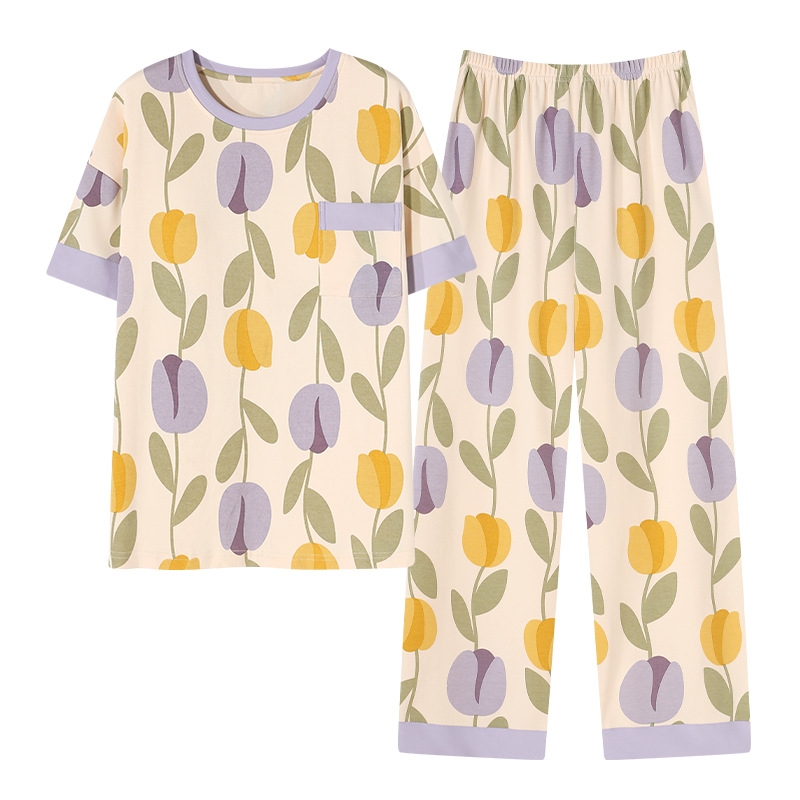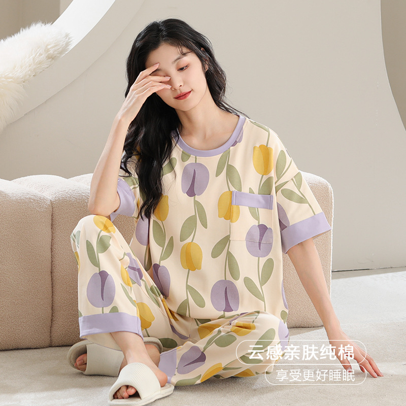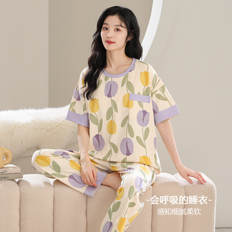 带胸垫睡衣女夏季纯棉薄款短袖长裤女士可外穿免穿文胸家居服套装