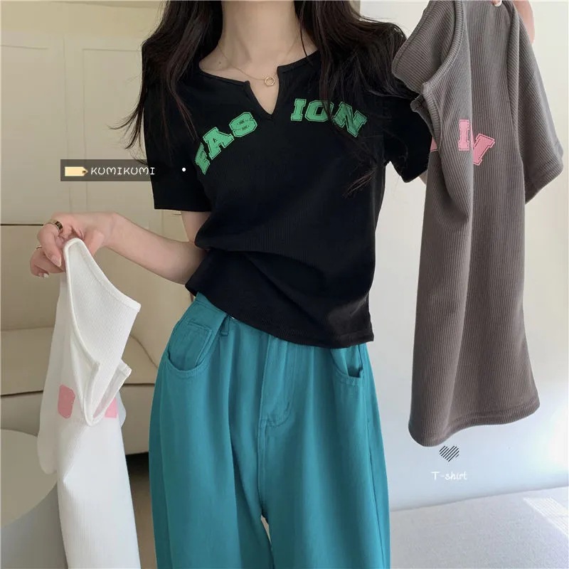 清仓捡漏折扣小众V领字母印花短袖T恤女夏短款显瘦设计感打底上衣
