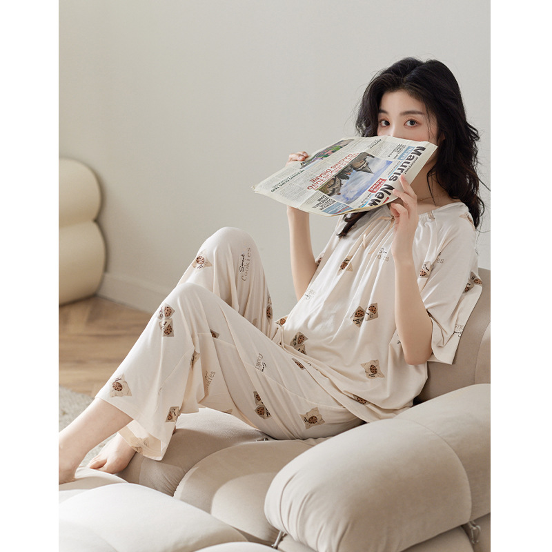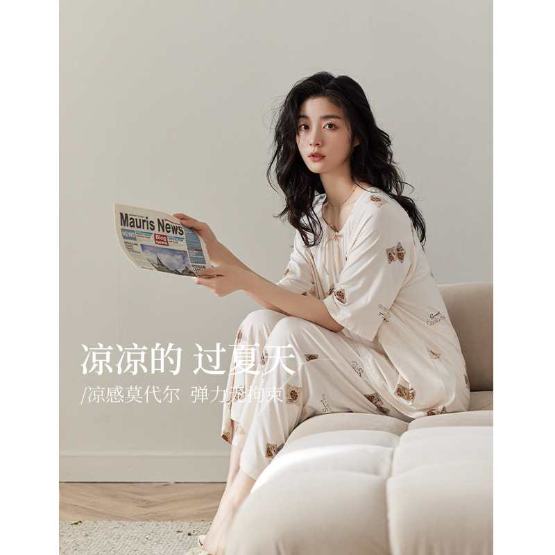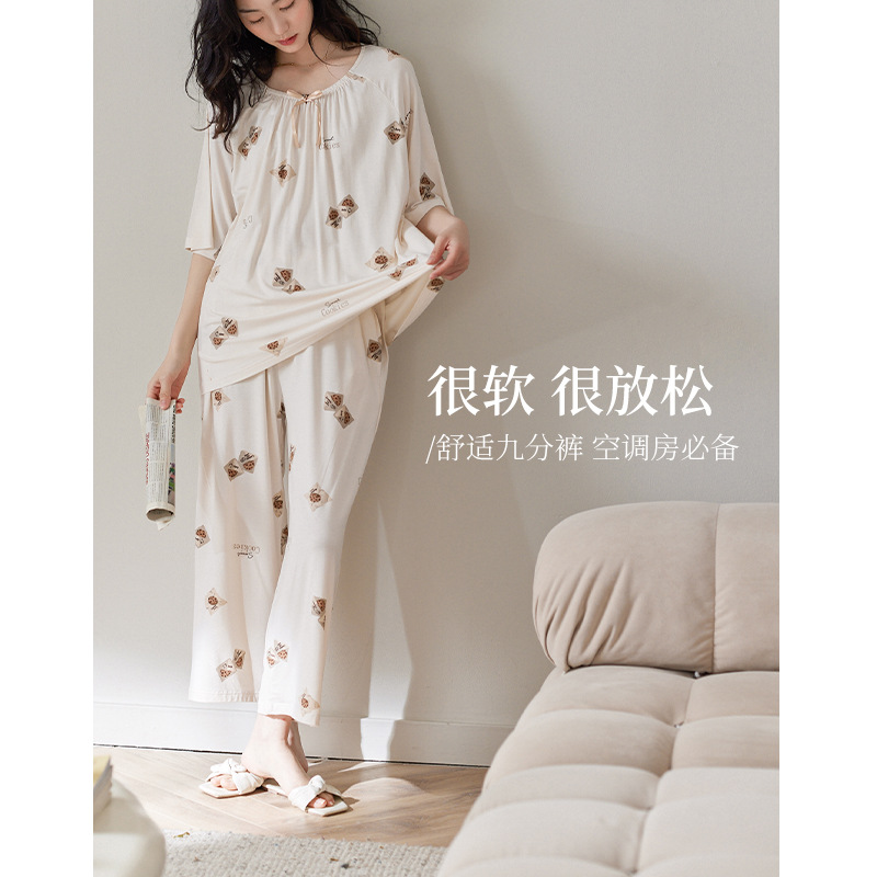 睡衣女士夏款莫代尔凉感薄款短袖九分裤甜美可外穿夏季家居服套装