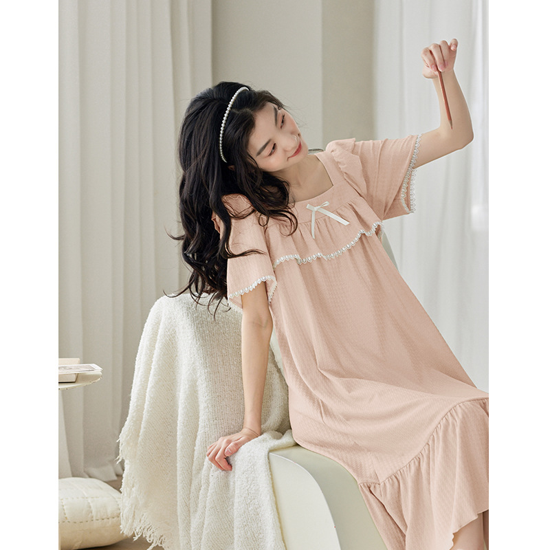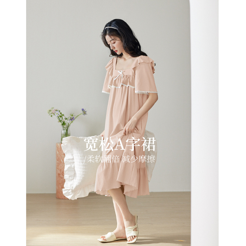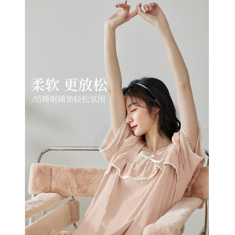 【超柔软】夏季睡裙女纯棉短袖长款甜美粉色少女睡衣连衣裙家居服
