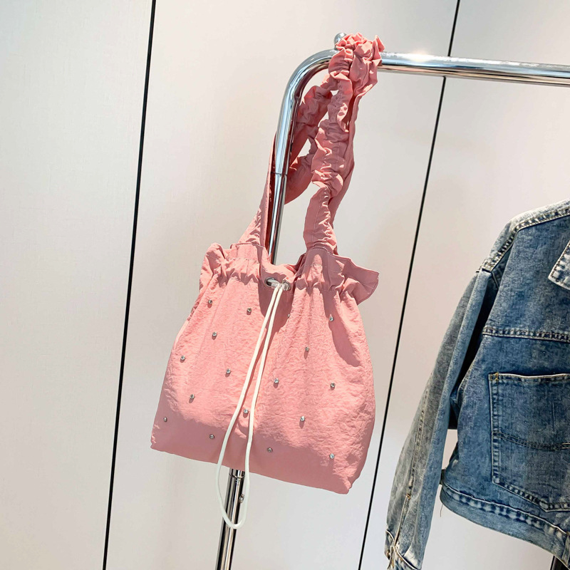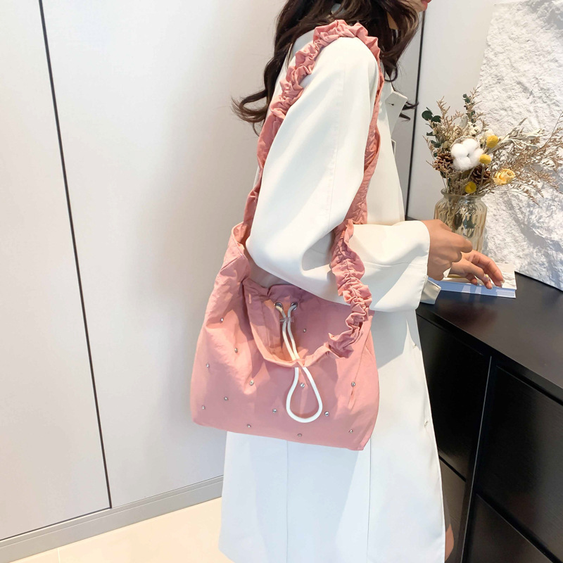 日韩新款小众休闲多巴胺撞色大容量斜挎水桶包尼龙防水束口单肩包