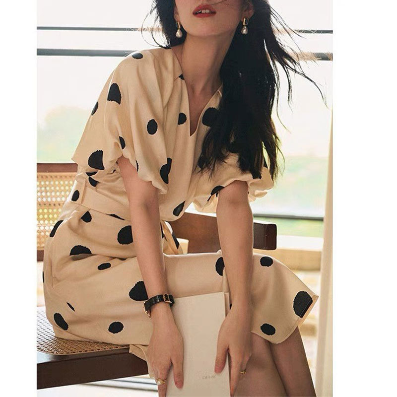 夏季新款法式茶歇中长款设计感小众裙子泡泡袖波点连衣裙女