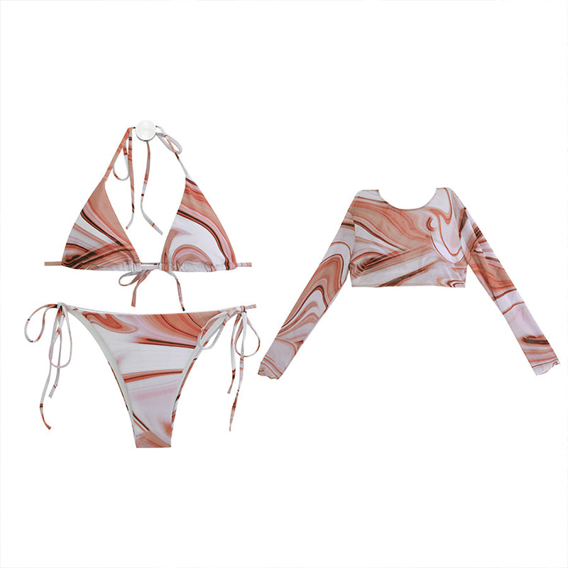 游泳衣女新款韩版性感修身时尚图案绑带长袖分体三角比基尼三件套
