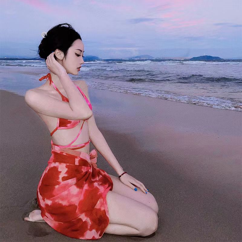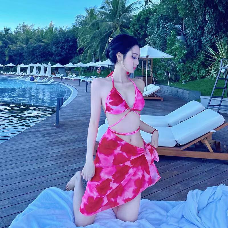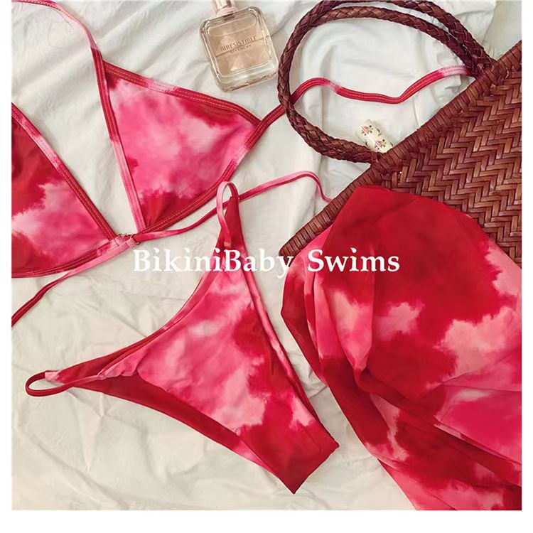 欧美风扎染分体比基尼三件套性感绑带ins风小胸聚拢温泉度假泳衣