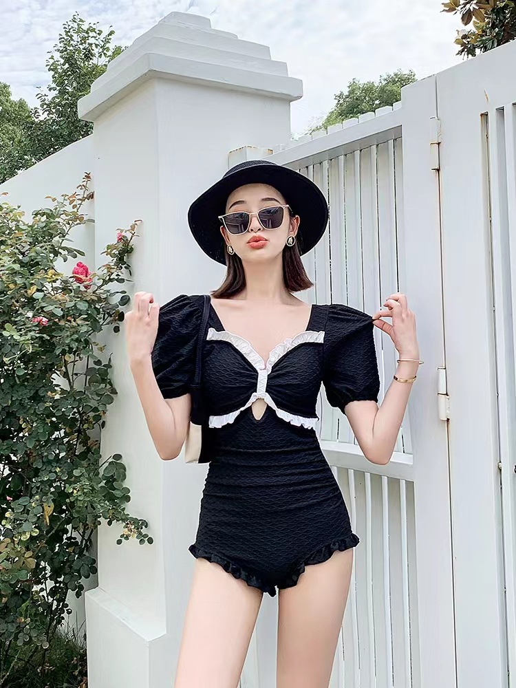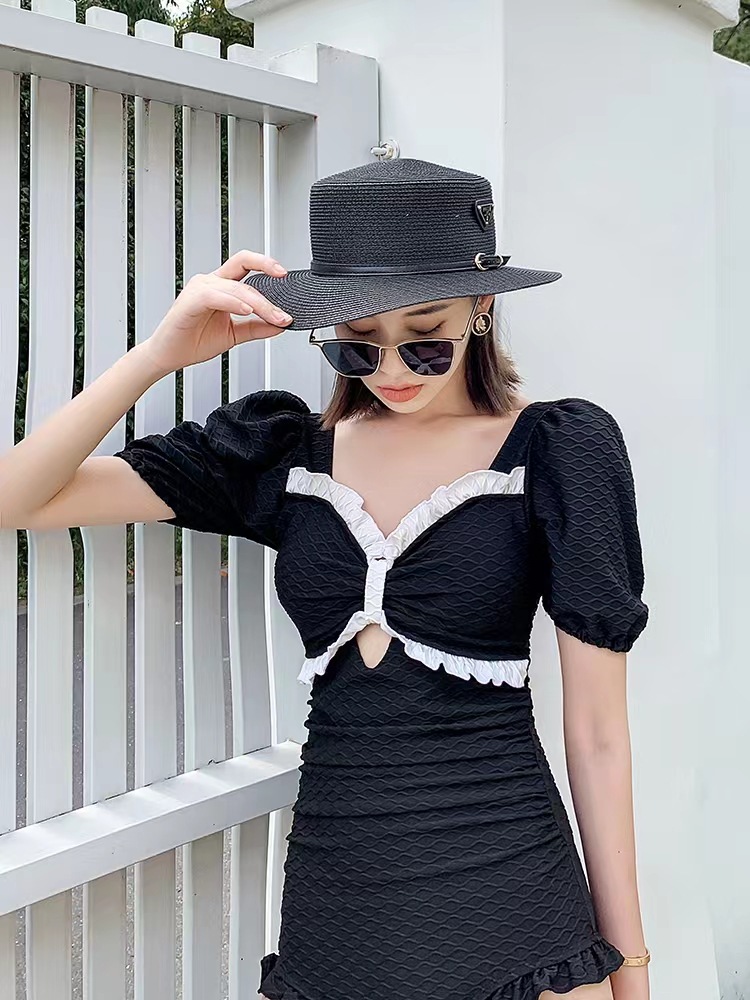 新款黑色爆款短袖温泉连体平角泳衣女保守遮肚显瘦学生游泳装裙式