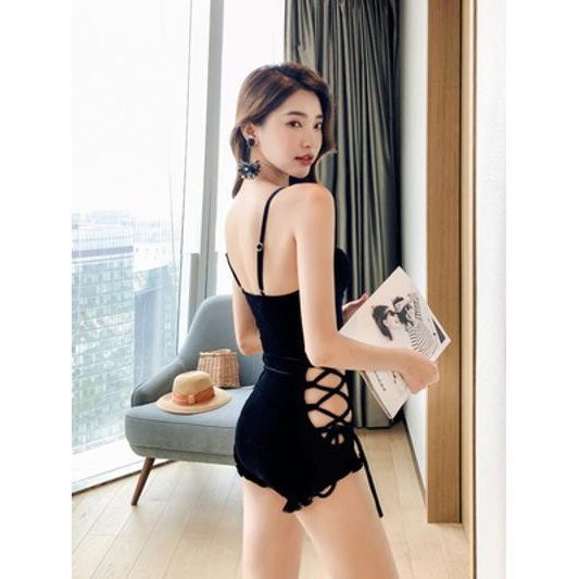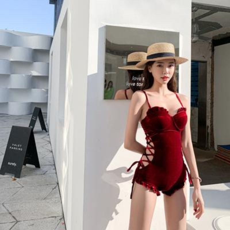 游泳衣女新款保守遮肚显瘦性感吊带复古丝绒连体泡温泉泳装