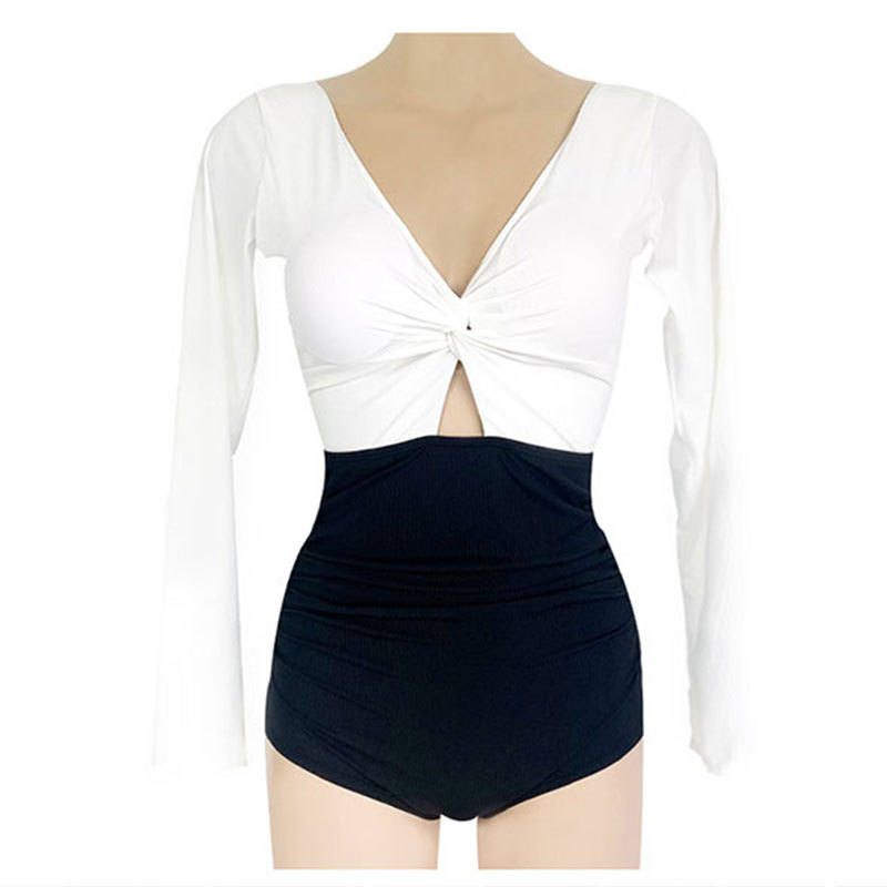 新款长袖泳衣女防晒保守连体修身遮肚显瘦性感拼色温泉泳衣
