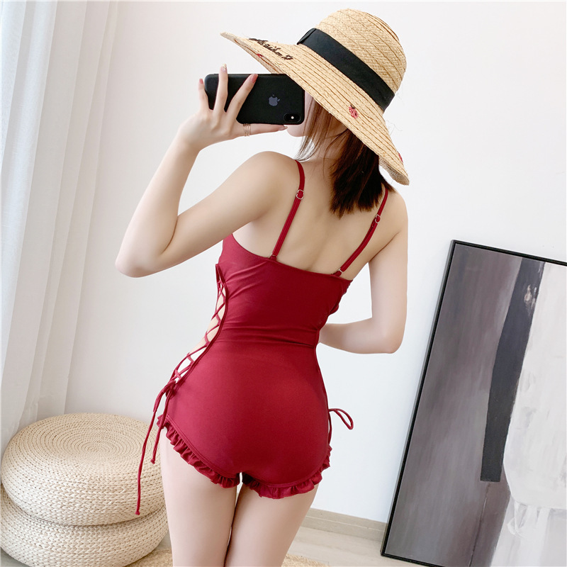 时尚新款女士连体纯色泳衣侧面绑带镂空性感比基尼遮肚显瘦泳衣女
