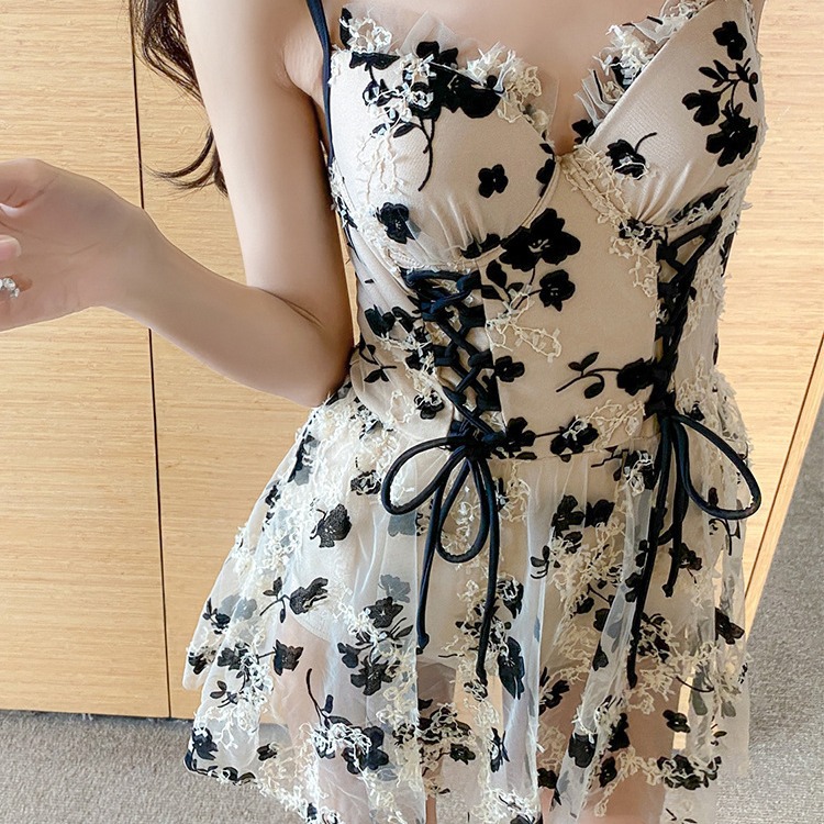 暗黑赫本风分割收腰吊带小黑裙小众高级感美背蓬蓬长裙新款潮