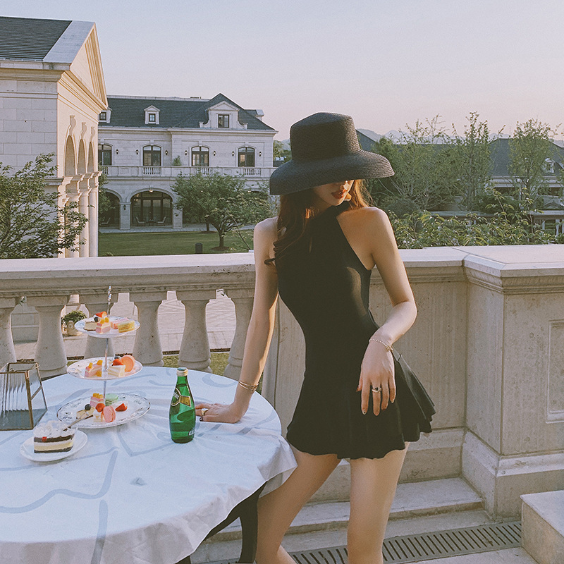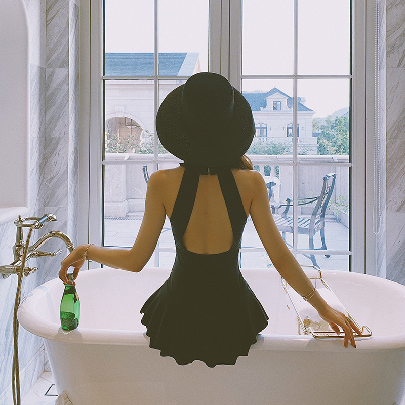 新款温泉泳装韩版小清新性感露背泳装ins风聚拢 连体裙式泳衣