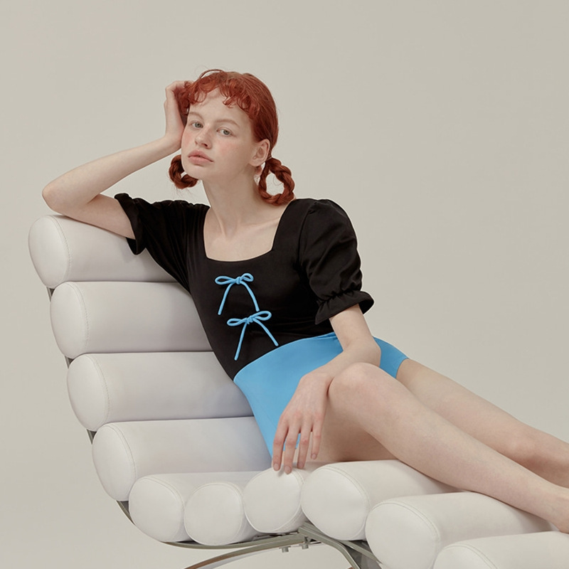 新款韩国连体泳衣女修身遮肚泡泡袖收腰性感小胸纯色拼接保守少女