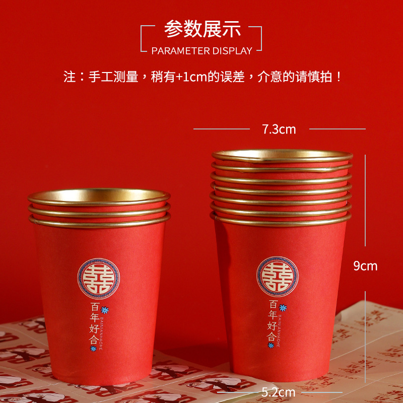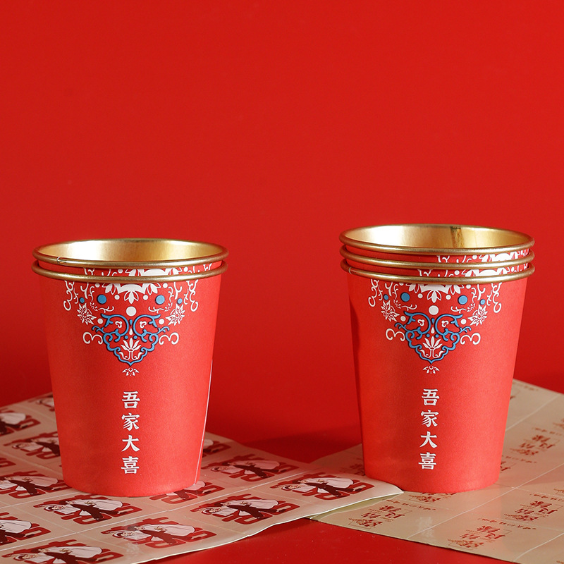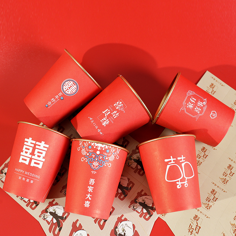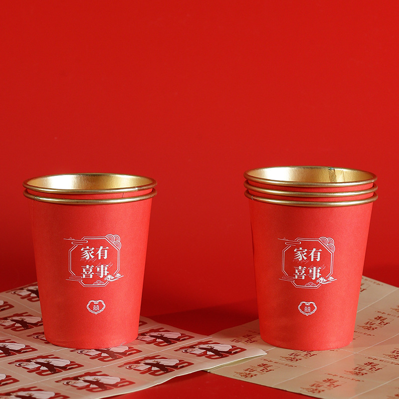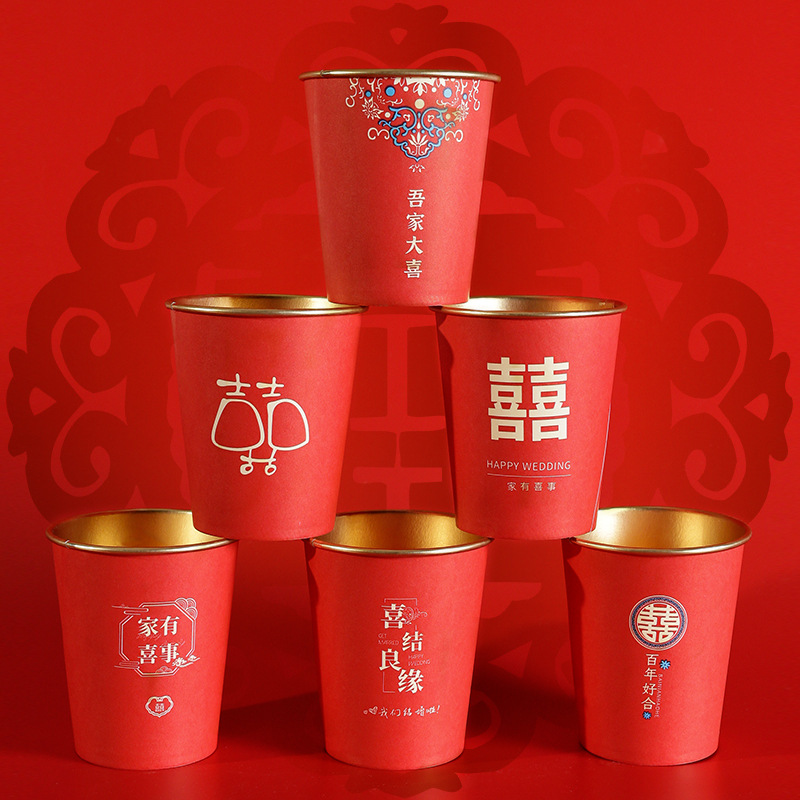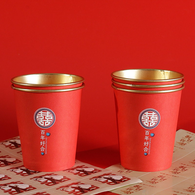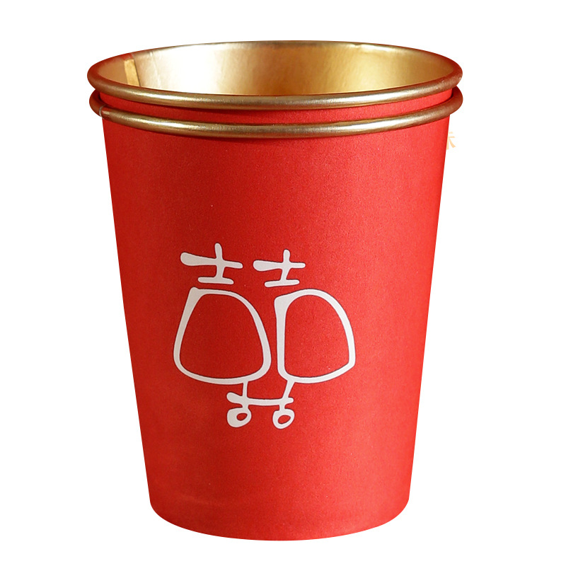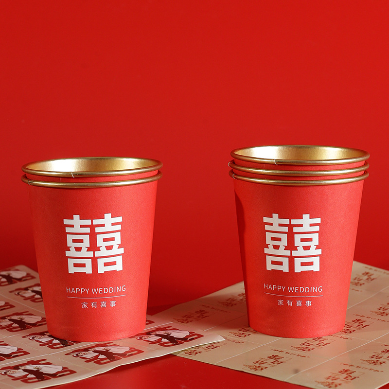 婚庆一次性加厚金箔纸杯婚宴茶水杯家用喜字红色高档结婚杯子