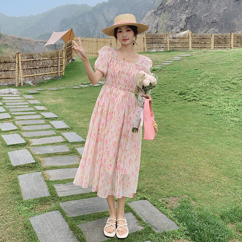 碎花粉色花田碎花连衣裙女夏季新款温柔风方领短袖a字裙