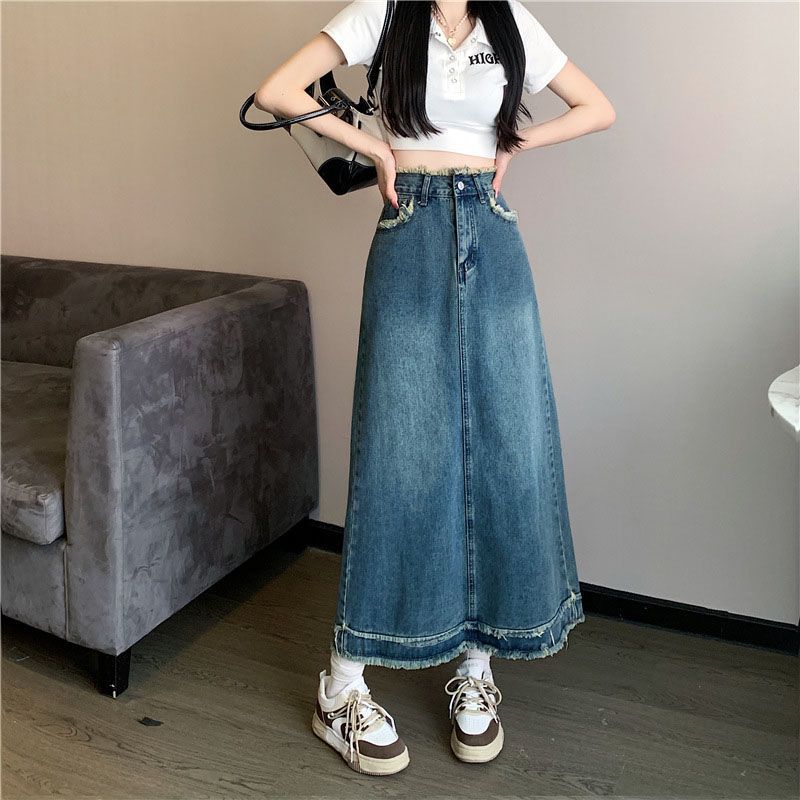 春夏新款a字裙复古蓝牛仔半身裙女高腰直筒中长裙洋气高级