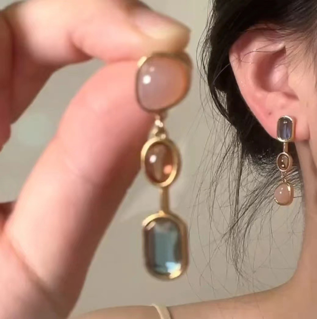 夏季爆款复古不对称彩色耳环小众设计复古撞色耳钉气质耳饰