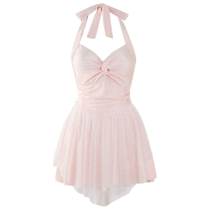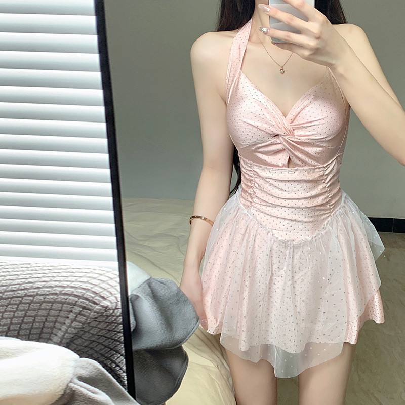 新款日挂脖泳衣女泡温泉连体遮肚显瘦纯欲学生高级感度假