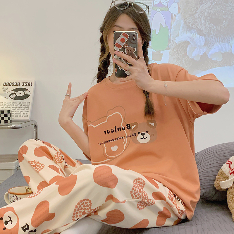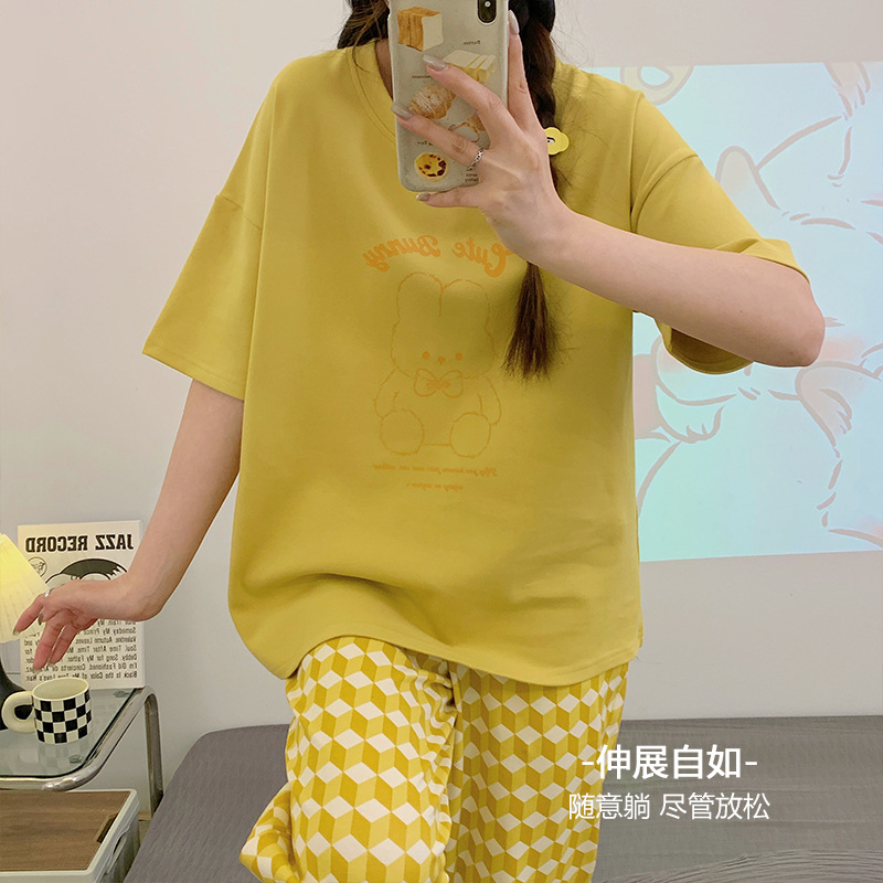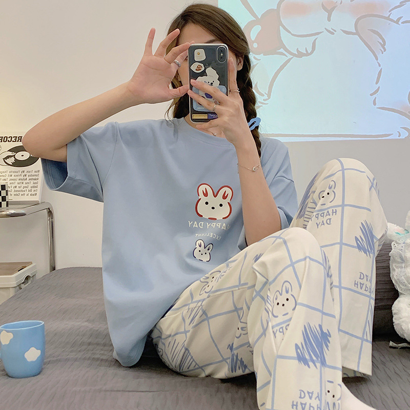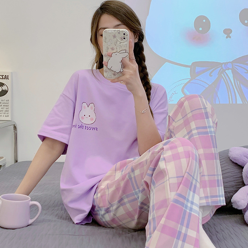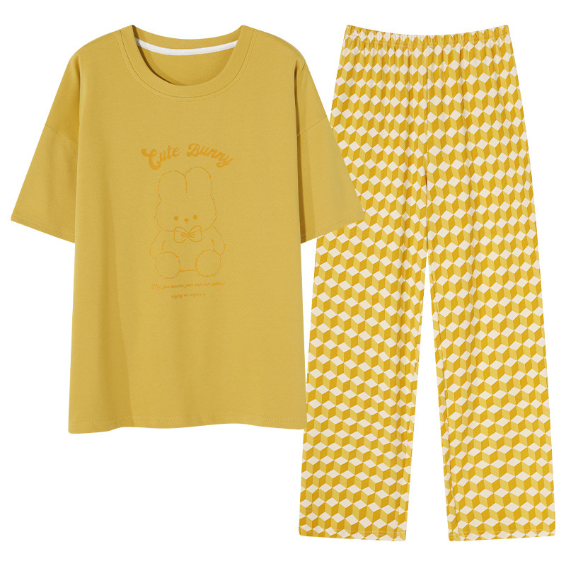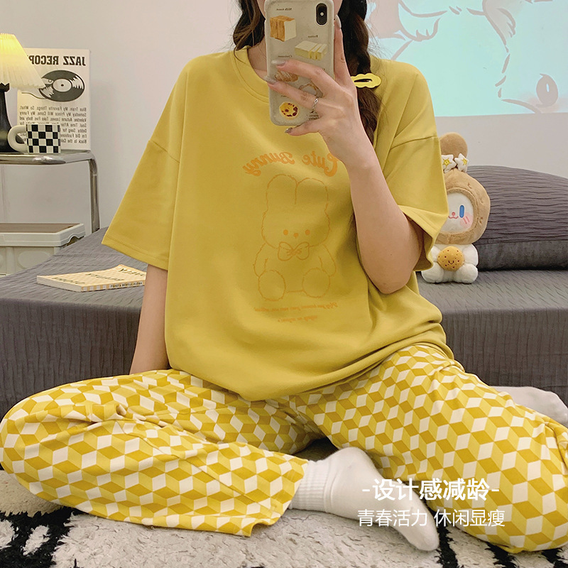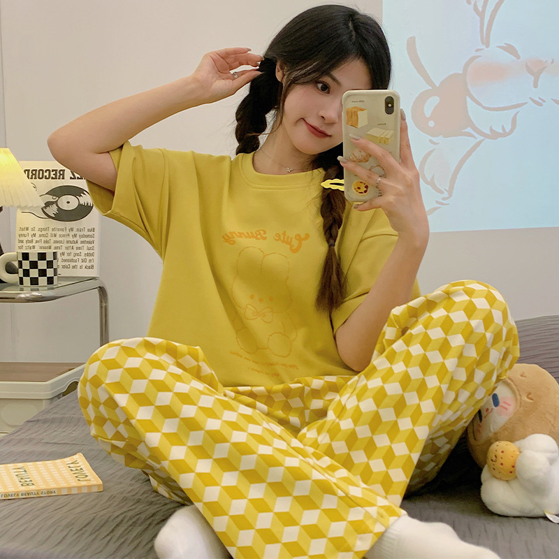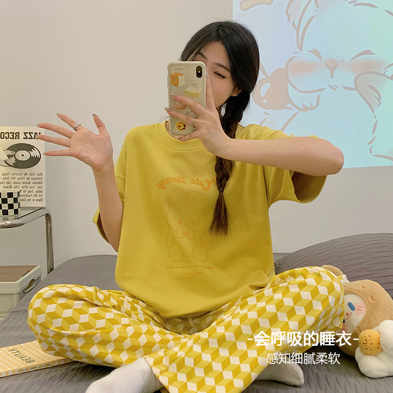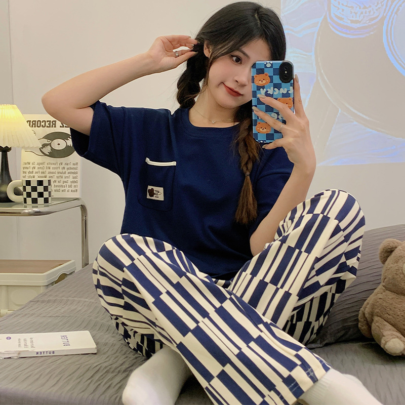年新款睡衣女夏季纯棉短袖长裤简约休闲少女生夏天家居服套装