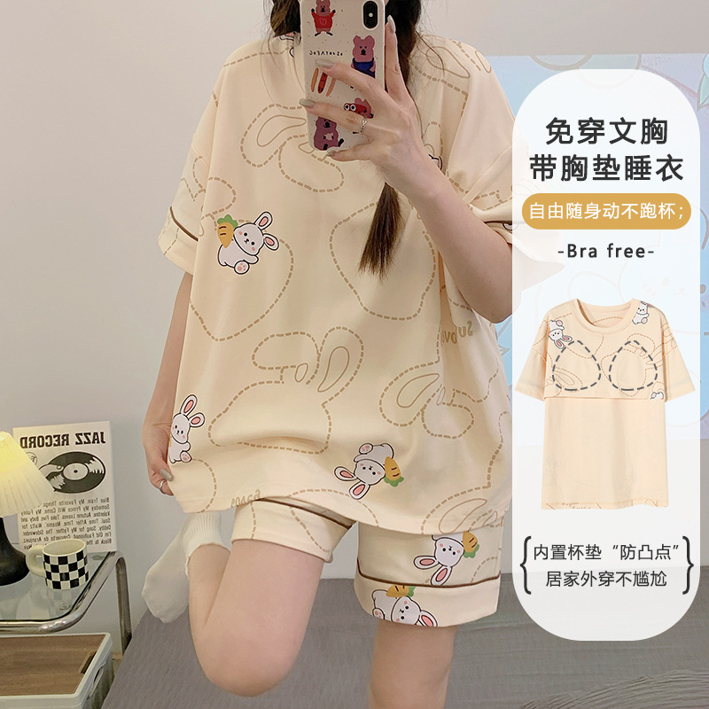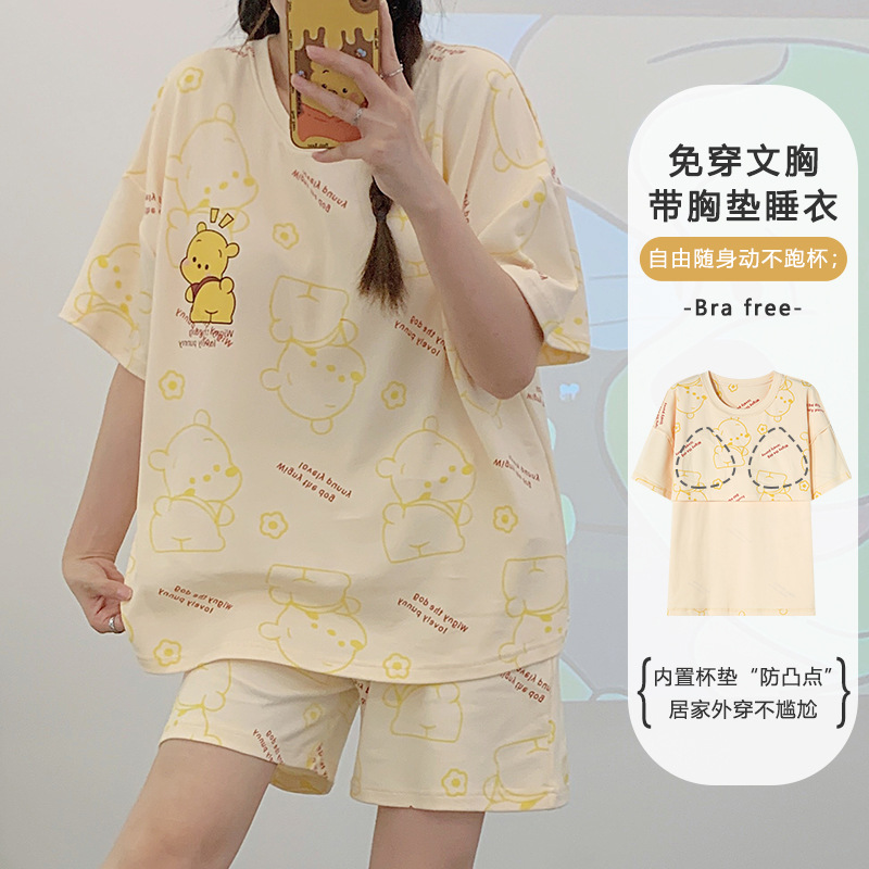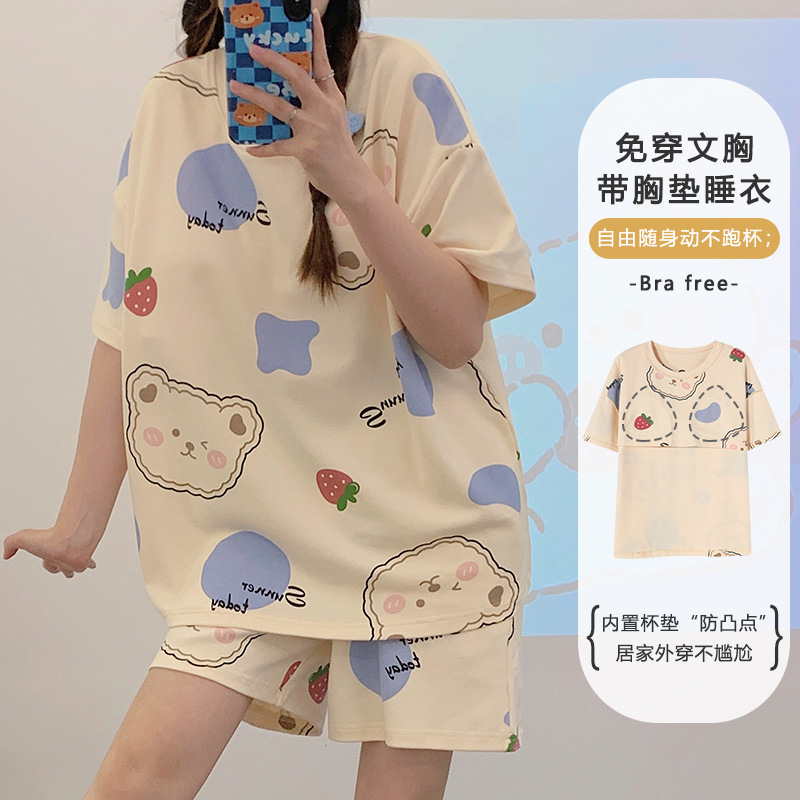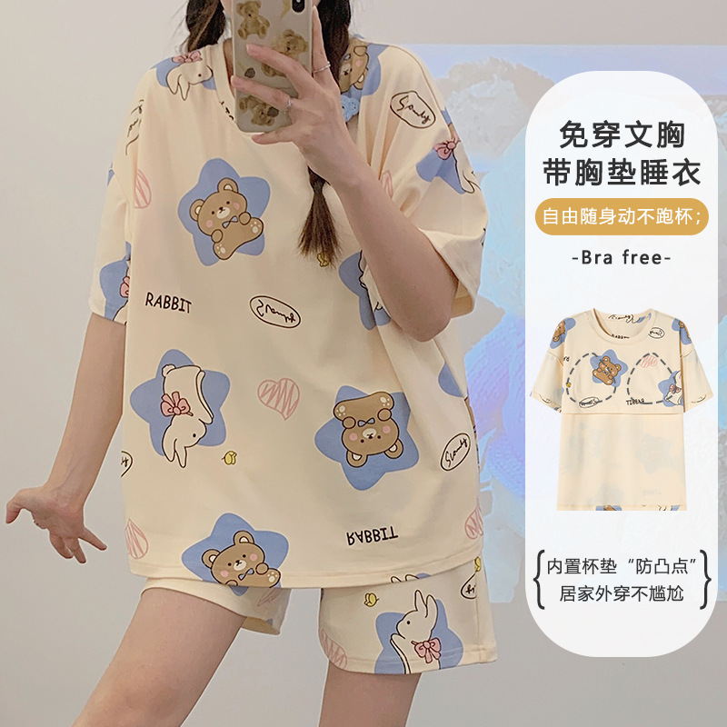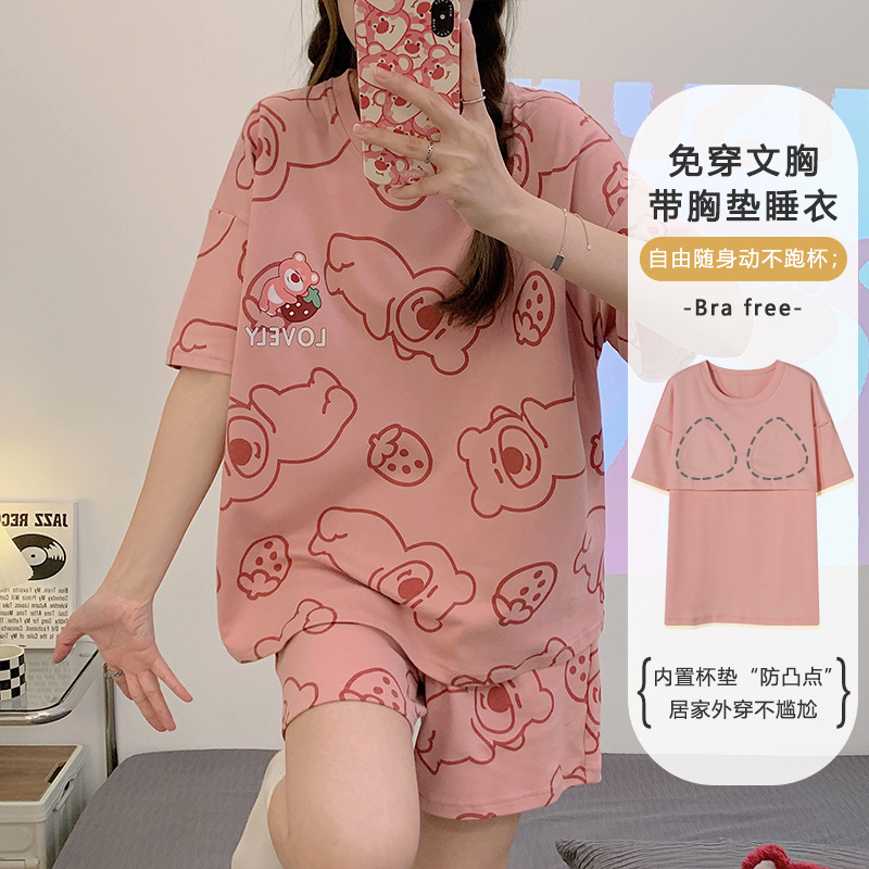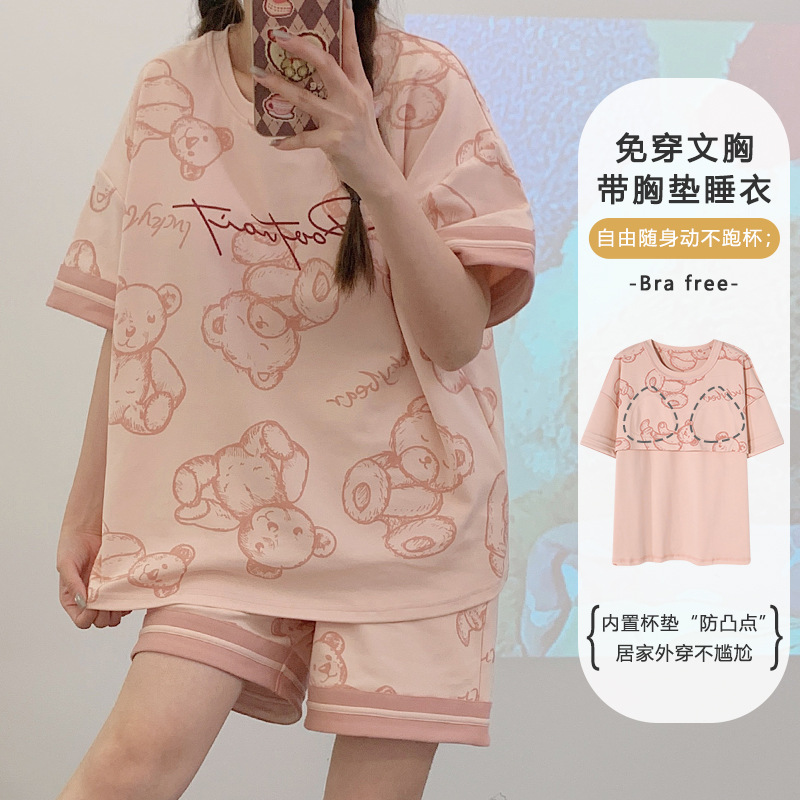 带胸垫睡衣女夏季纯棉短袖可外穿休闲少女生卡通家居服年新款