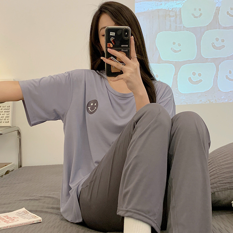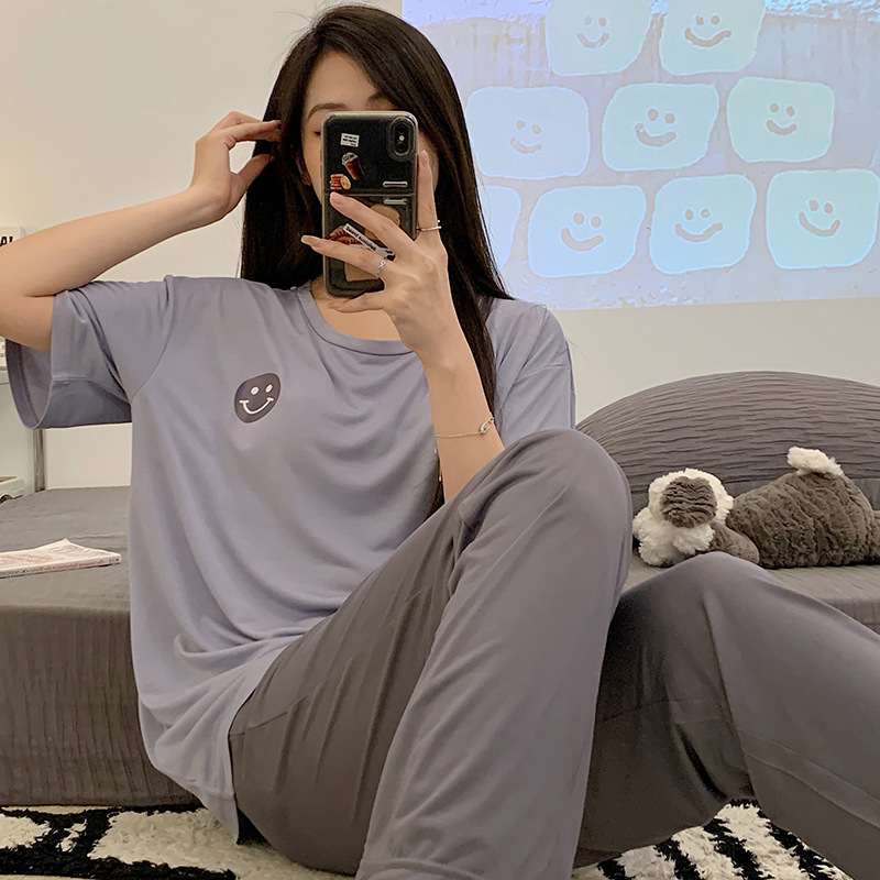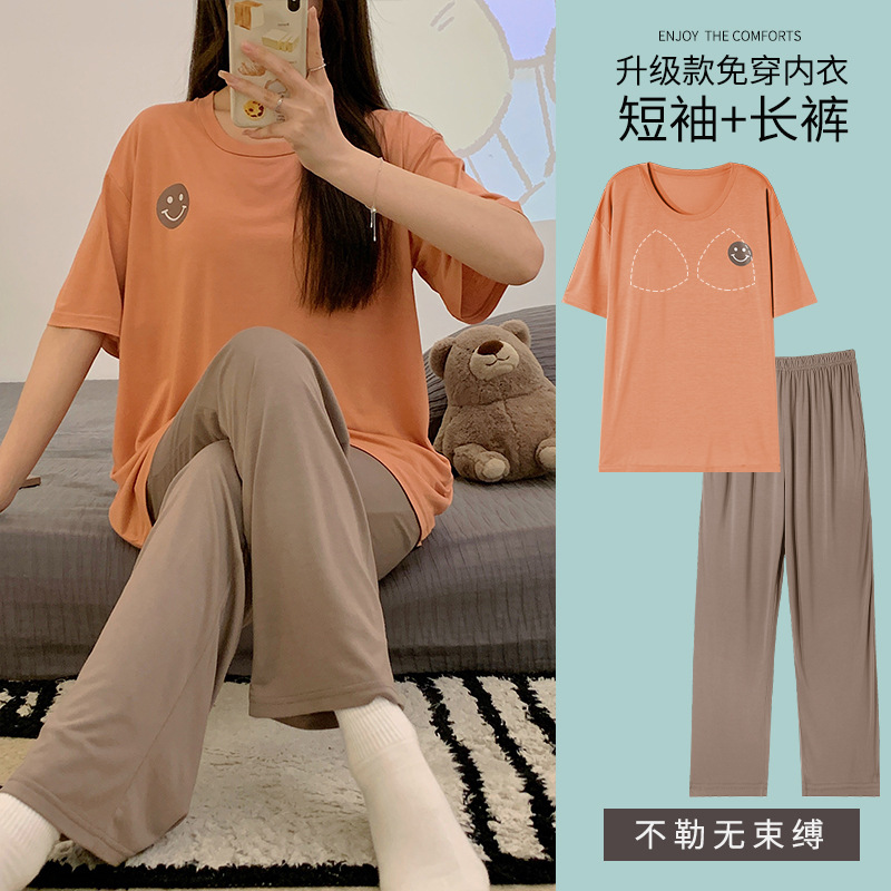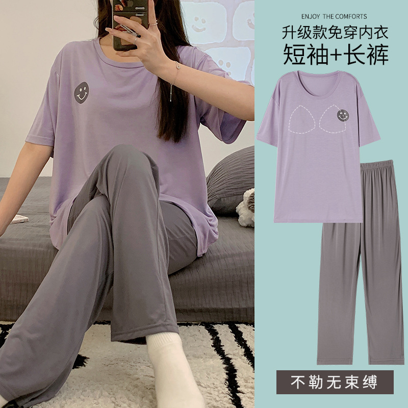 带胸垫一体睡衣女士夏季纯棉薄款短袖长裤防凸点可外穿家居服套装