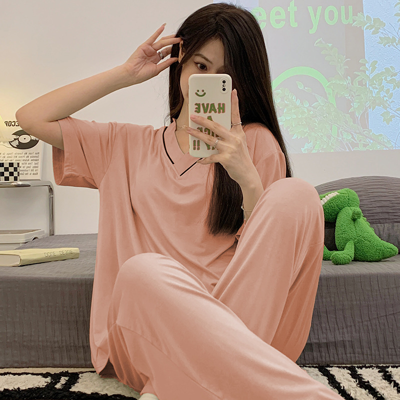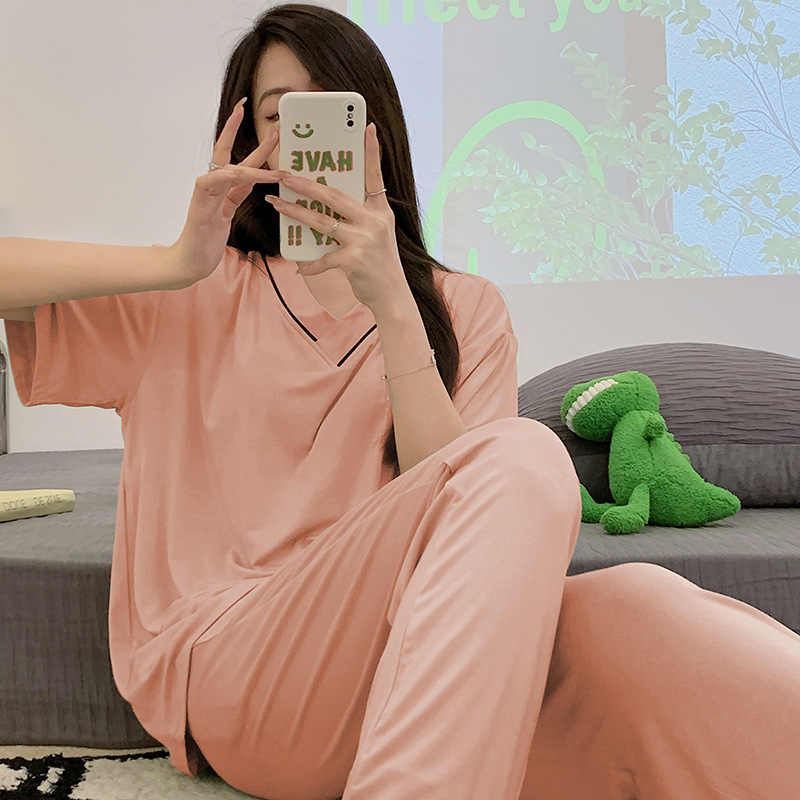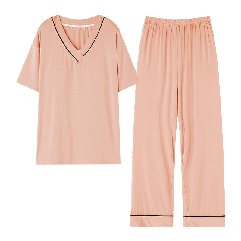新款带胸垫睡衣女士夏季纯棉短袖长裤简约可外穿家居服夏天
