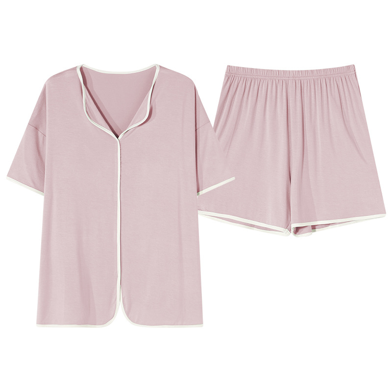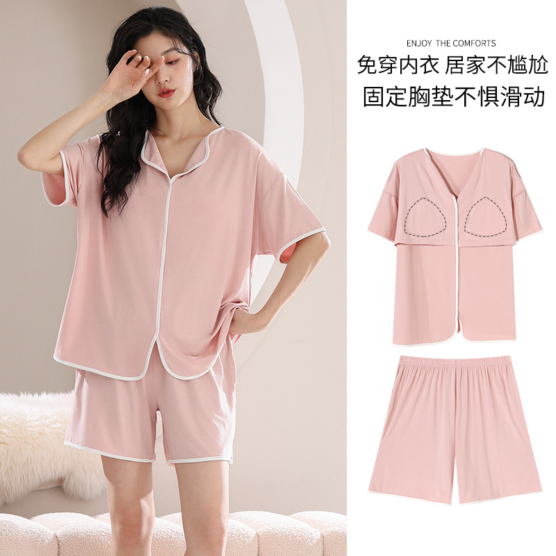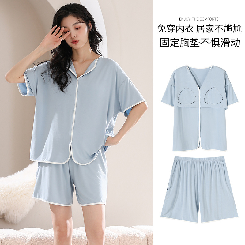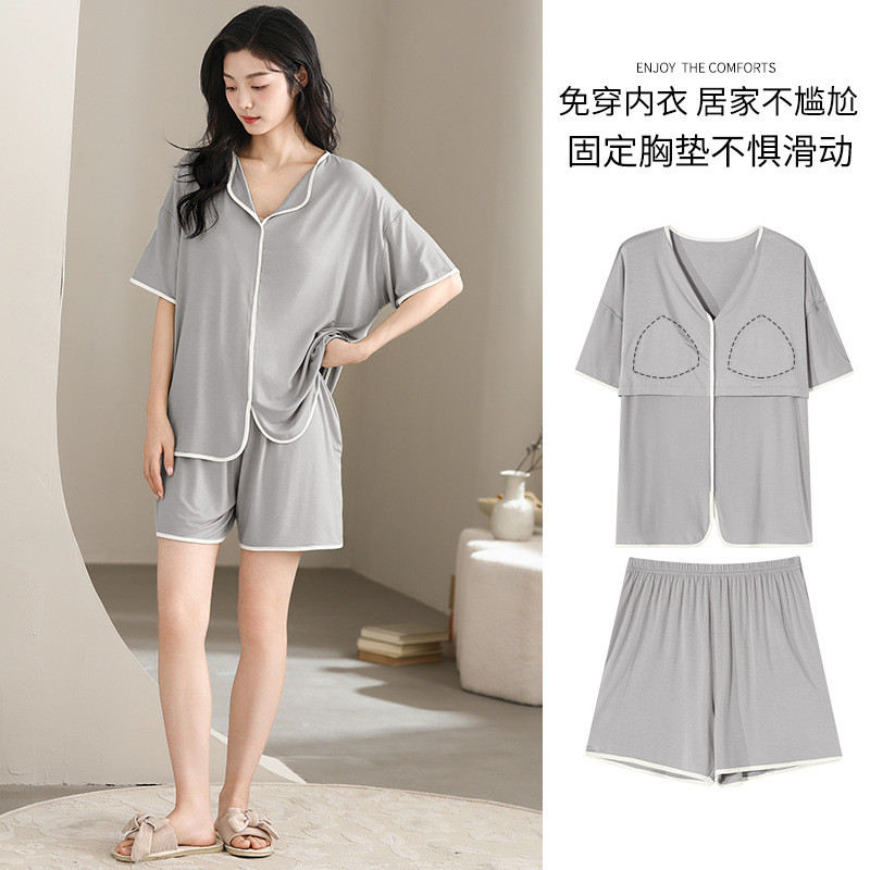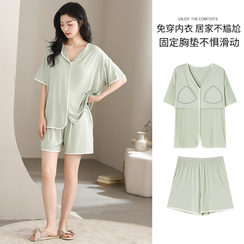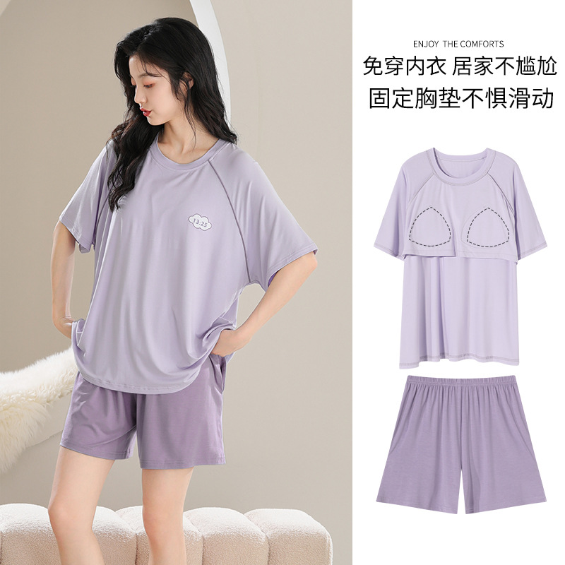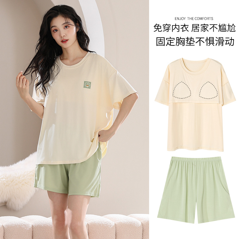 年新款睡衣女士夏季莫代尔短袖休闲纯色带胸垫一体家居服夏天