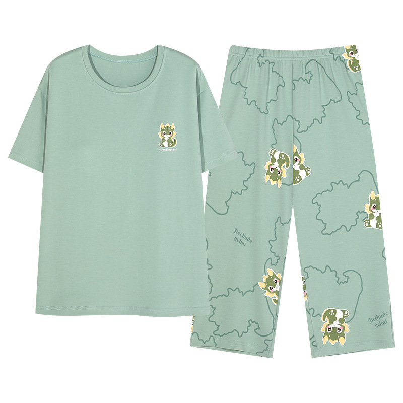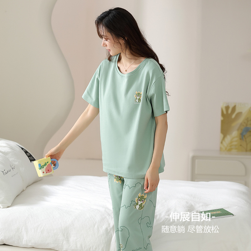 年新款带胸垫睡衣女夏季纯棉短袖七分裤甜美休闲可外穿家居服