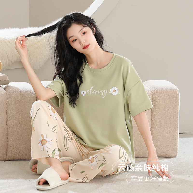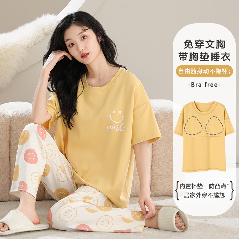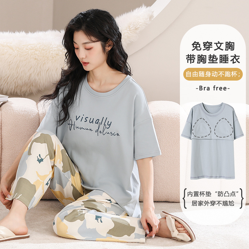 带胸垫睡衣女款夏季纯棉短袖长裤休闲夏天可外穿女士防凸点家居服