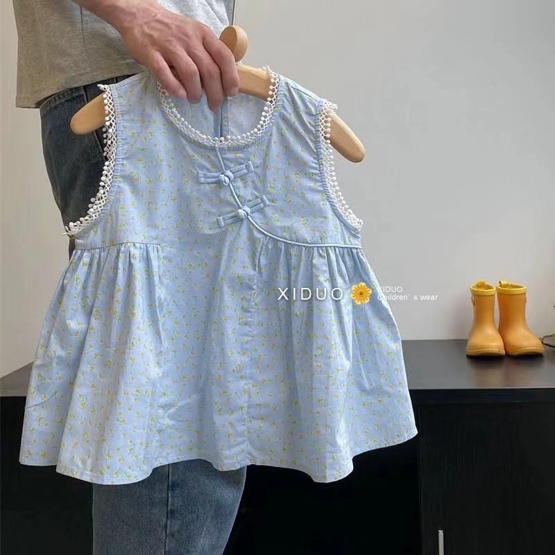 夏季女童装无袖衬衣宝宝洋气儿童个性潮中国风盘扣碎花流苏娃娃衫