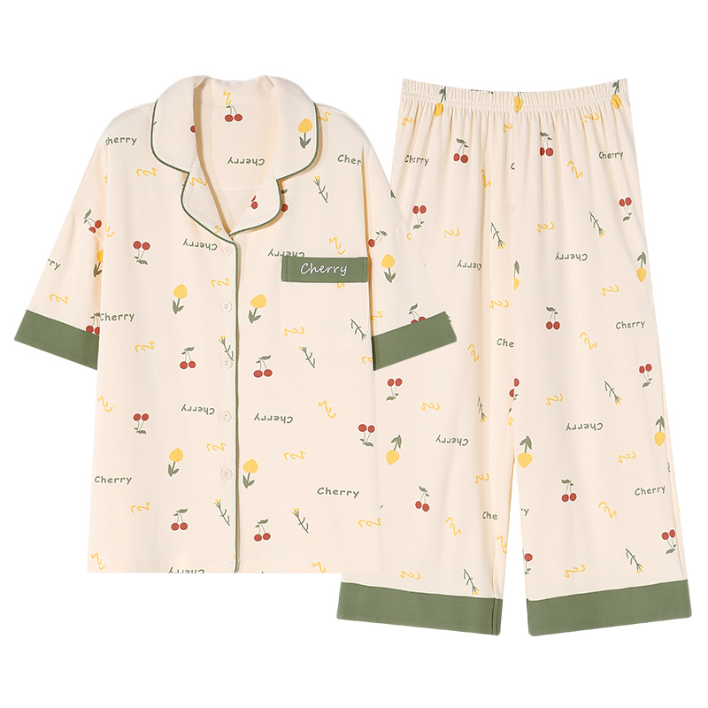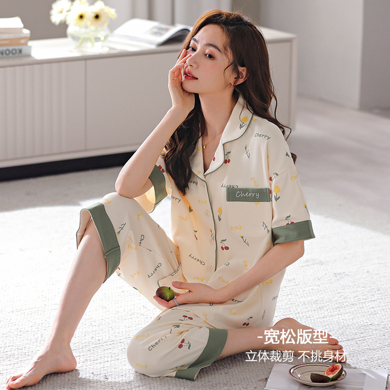 年新款睡衣女夏季纯棉短袖七分裤女士甜美开衫翻领家居服夏天