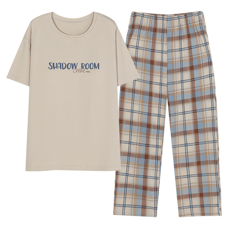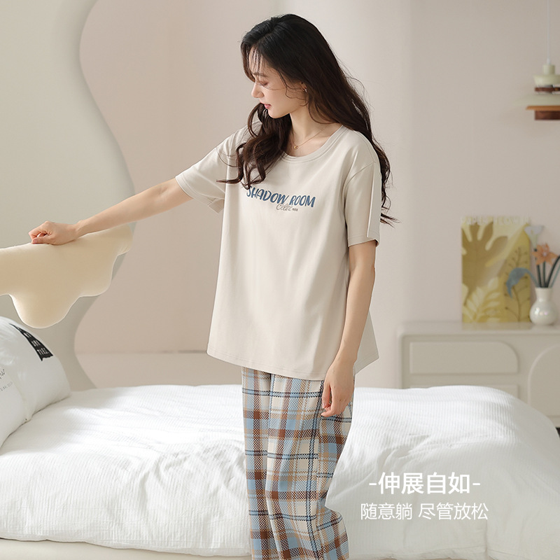 年新款带胸垫睡衣女夏季纯棉短袖长裤免穿文胸家居服外穿套装