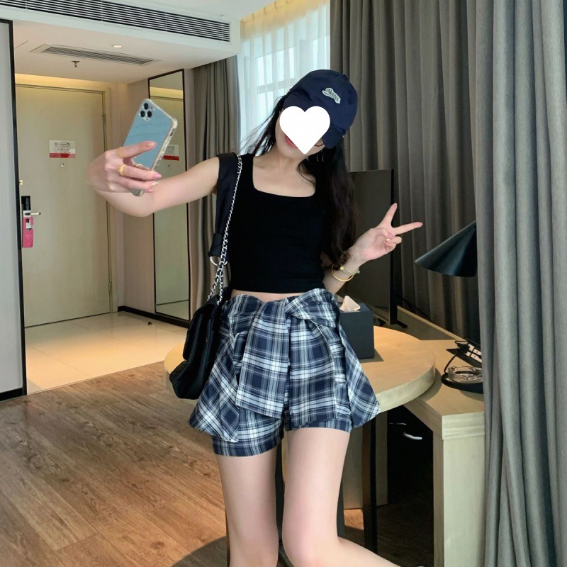夏季新款设计不规则格子短裙裤女气质高腰半身裙显瘦裤裙