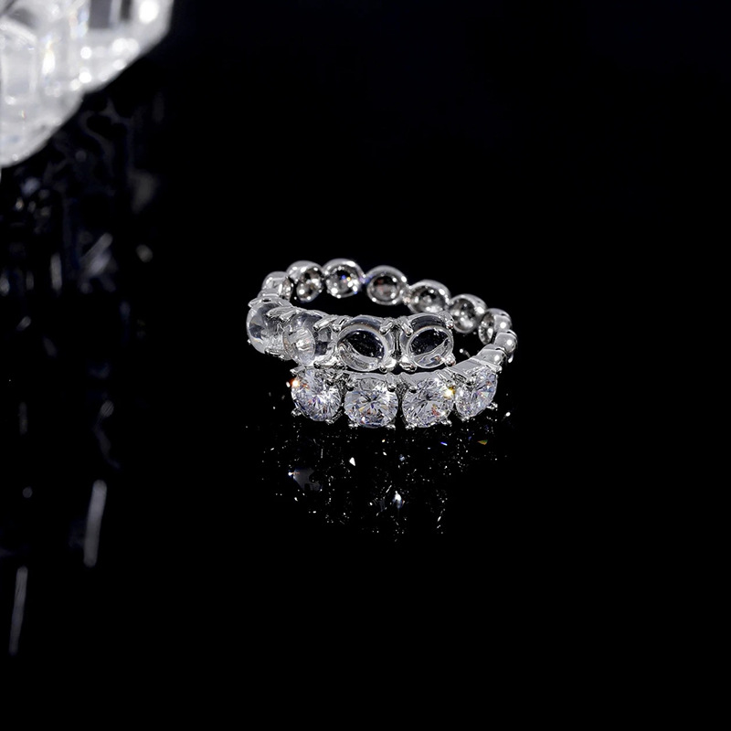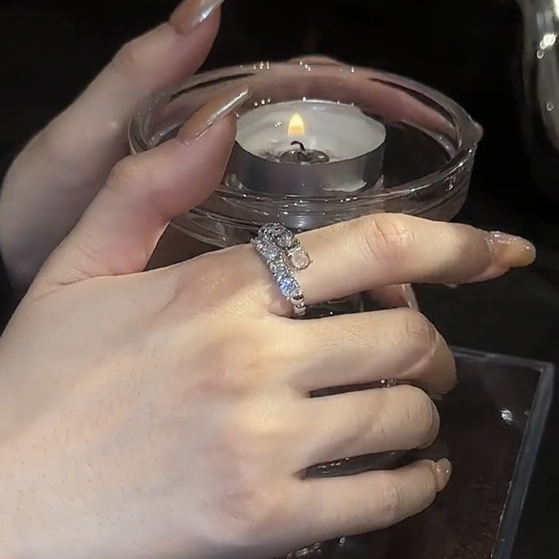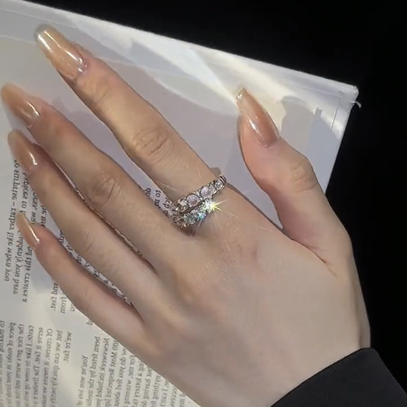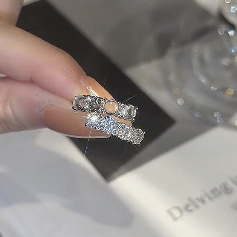 银色微镶锆石水晶开口戒指气质时尚双层百搭时尚戒指开口可调节