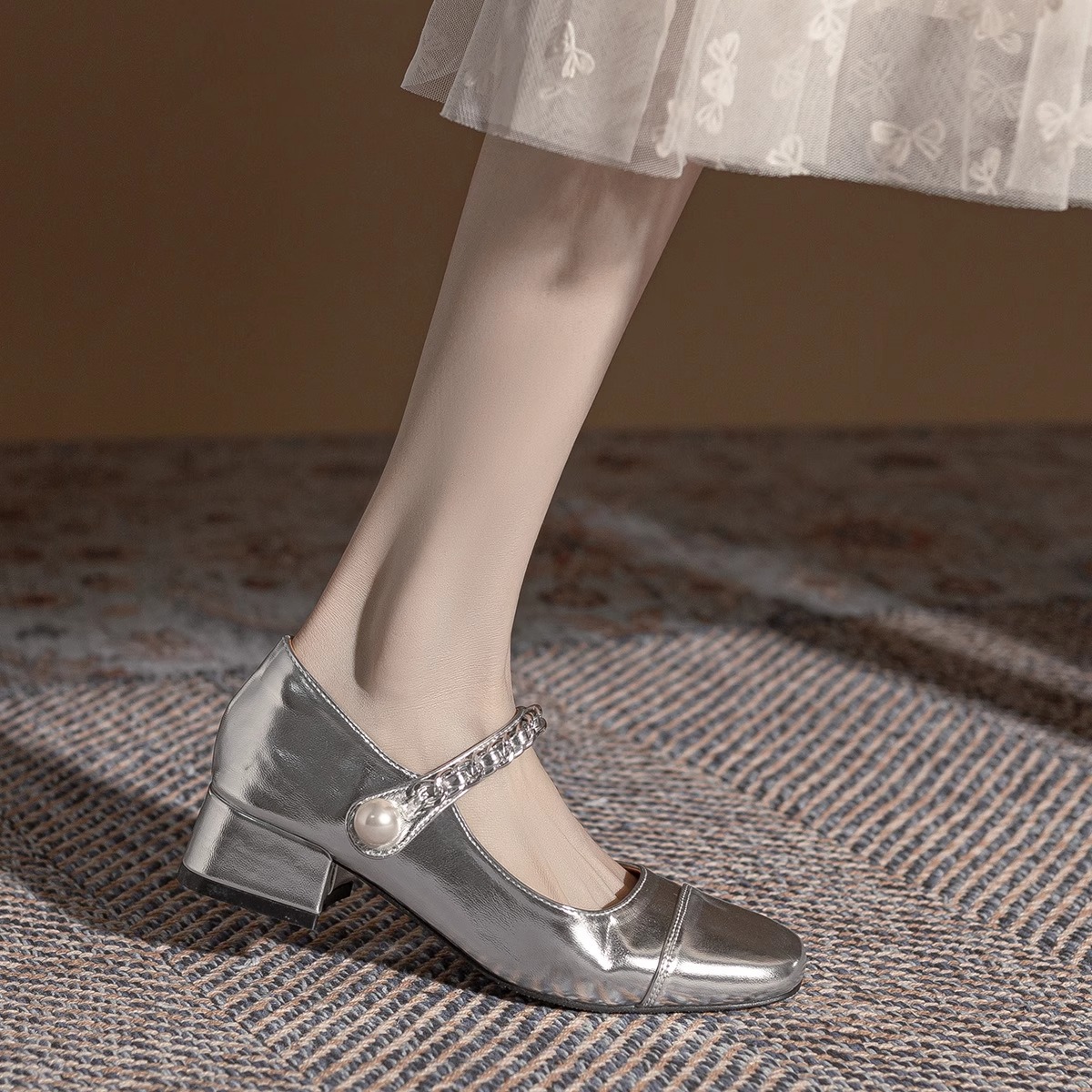 法式复古银色粗跟玛丽珍鞋女2025新款夏季小皮鞋百搭浅口高跟单鞋