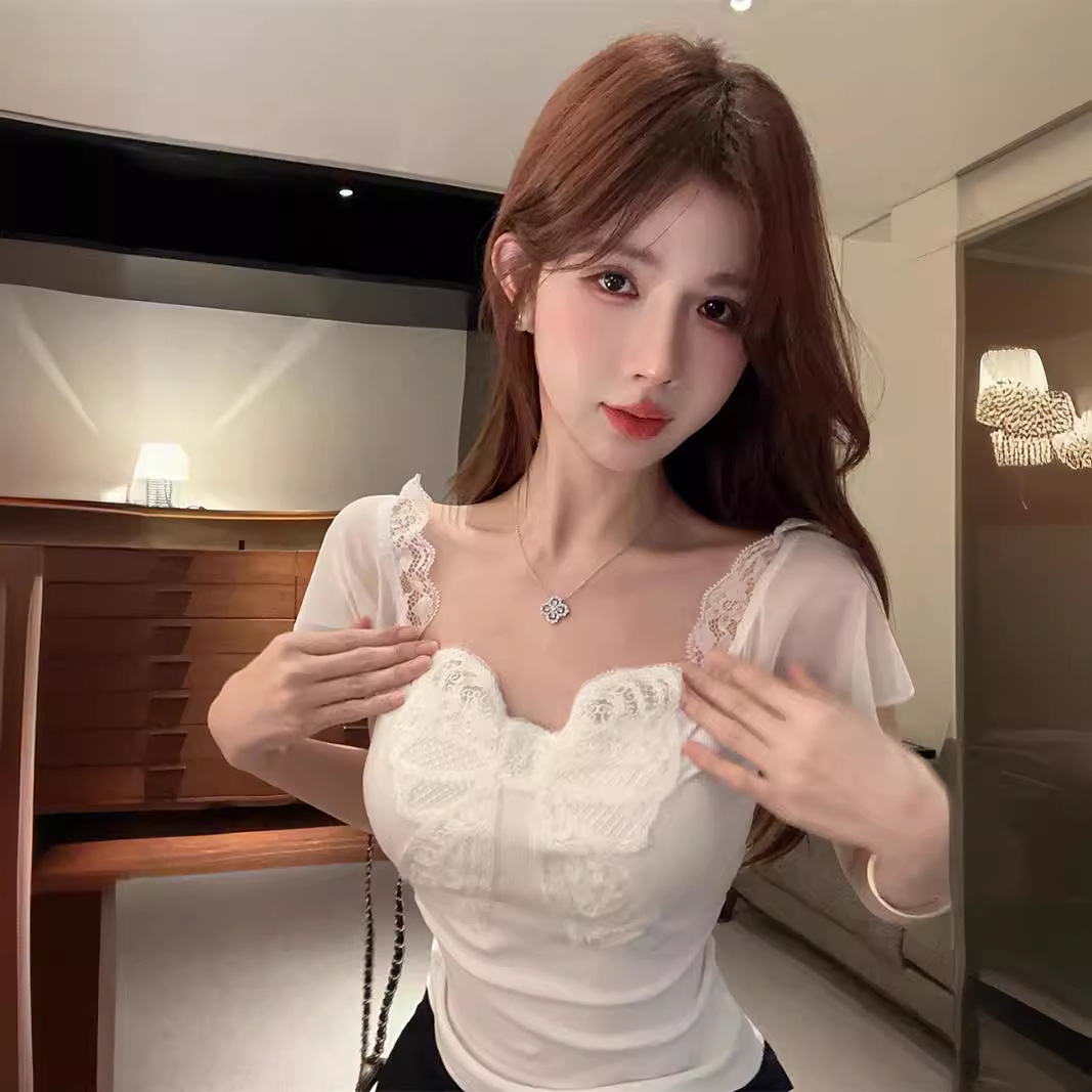 设计感小众别致蝴蝶结拼接蕾丝花边上衣夏修身显瘦短款方领T恤女