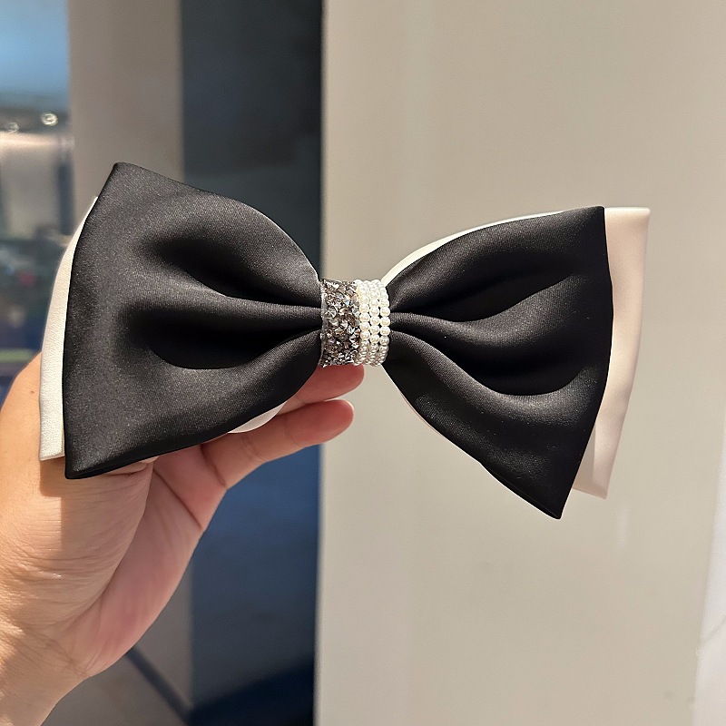 缎面拼色蝴蝶结发夹轻奢高级感珍珠镶钻半扎发弹簧夹优雅气质发饰