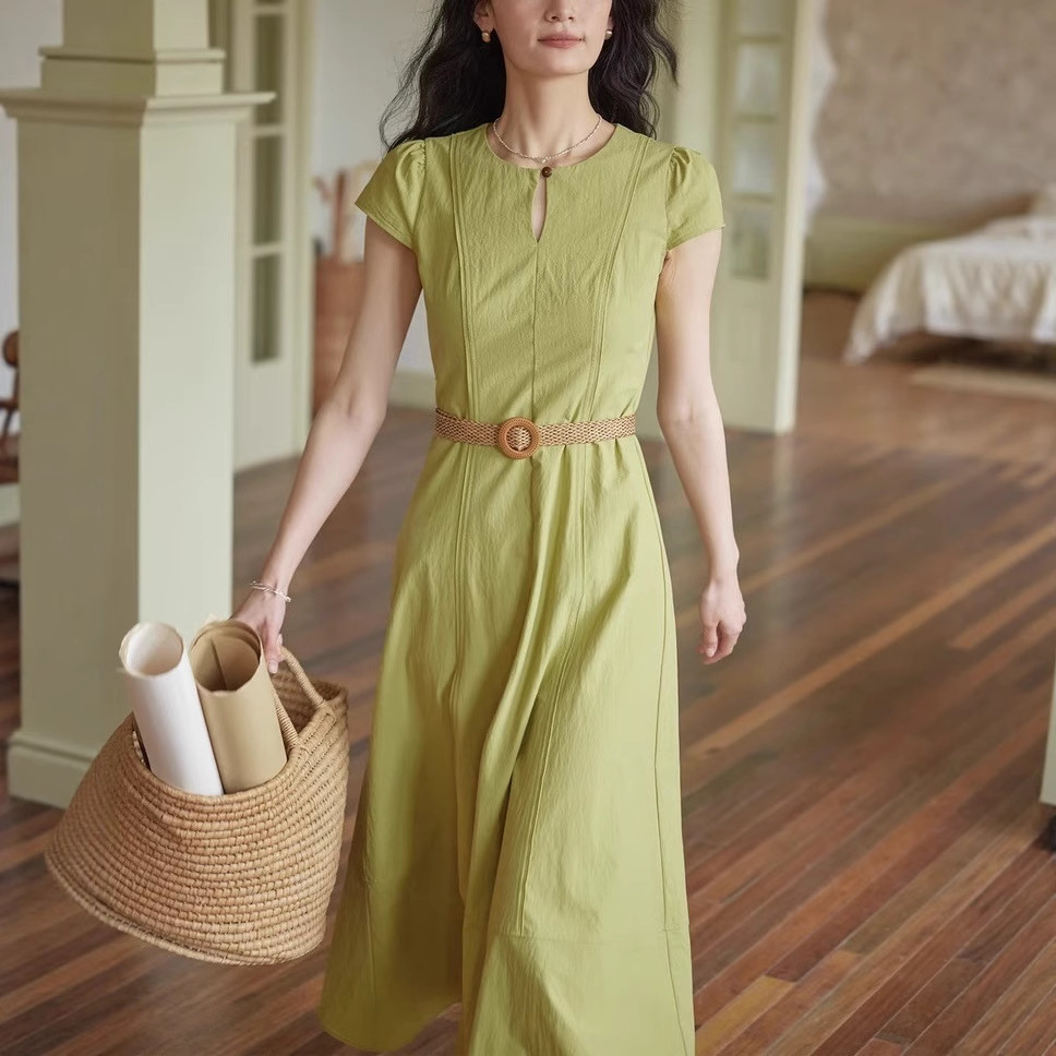 solghter法式一粒扣圆领收腰连衣裙气质显瘦长裙
