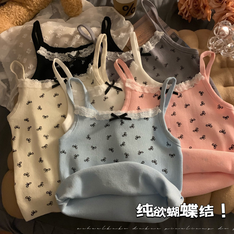 甜美风蕾丝边蝴蝶结吊带背心女弹性修身短款上衣