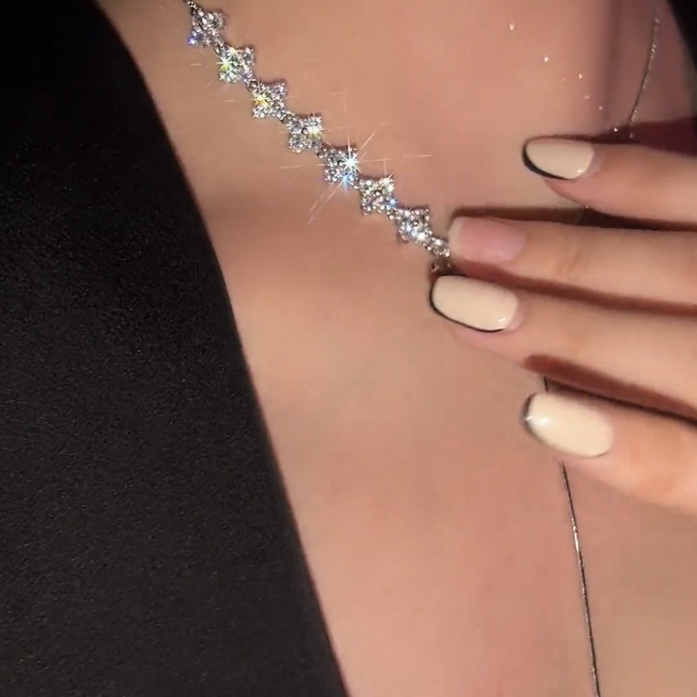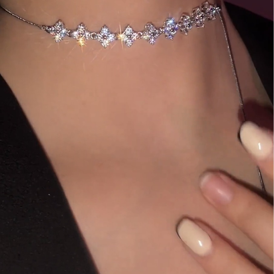 银色微镶锆石四叶锆石项链可抽拉调节创意锁骨链女冷淡百搭轻奢风