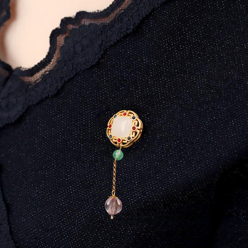 中国风复古镀金镂空胸针女古风仿和田玉胸花别针丝巾扣旗袍配饰