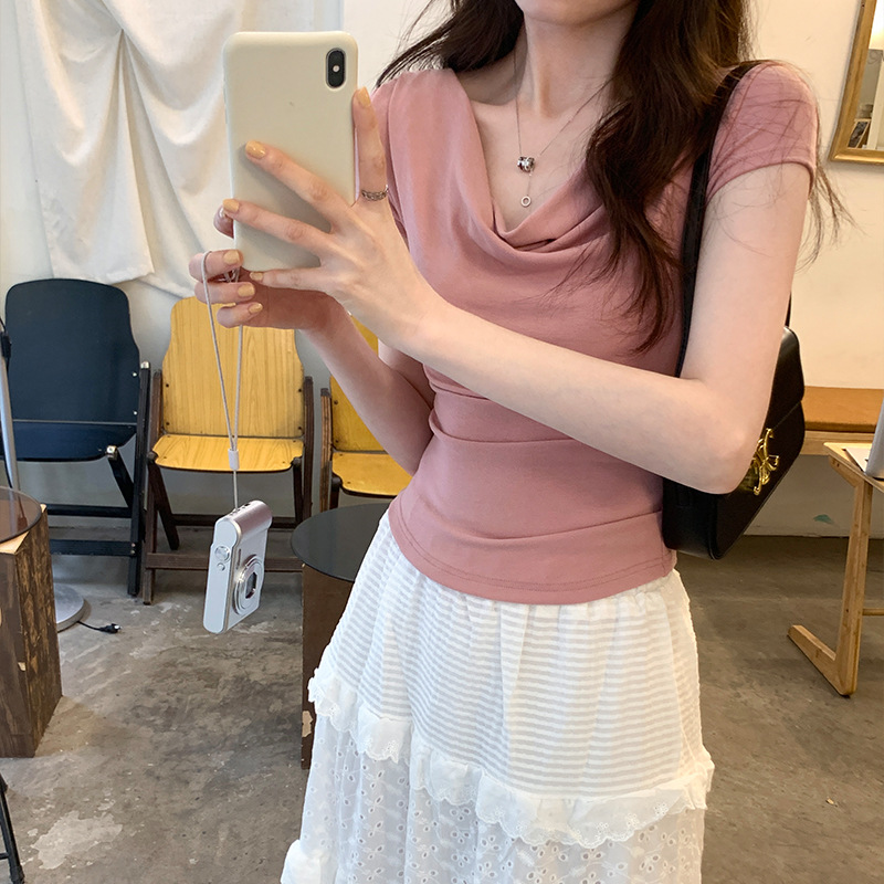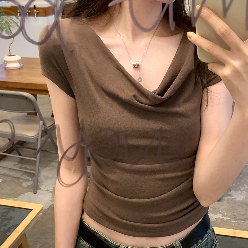 设计感小众荡领修身显瘦弹力短袖T恤女夏季新款辣妹短款上衣