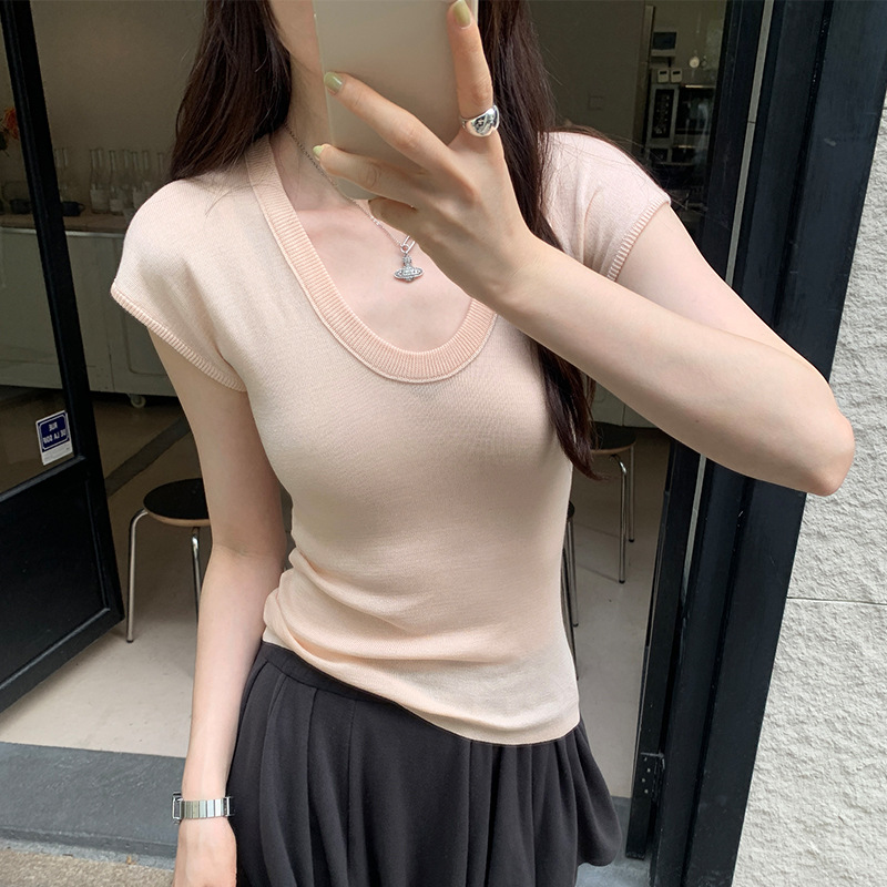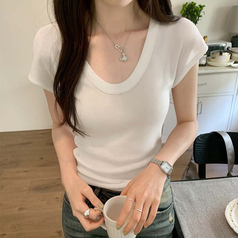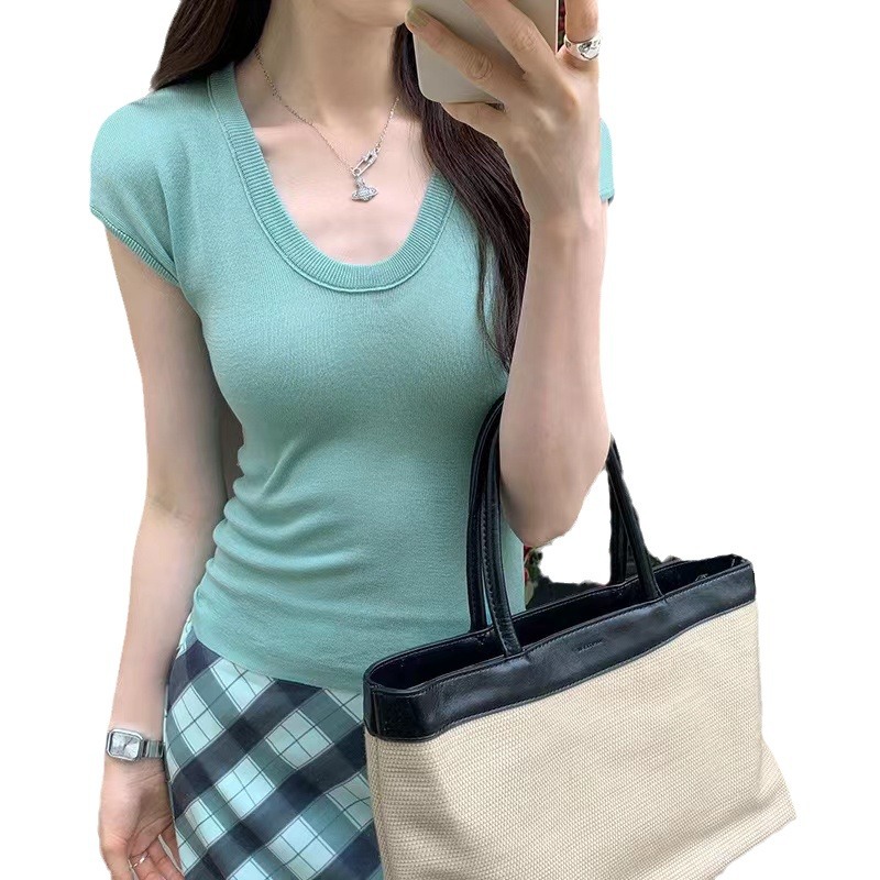 基础款纯色U领正肩短袖针织衫t恤女夏季新款弹力修身百搭内搭上衣