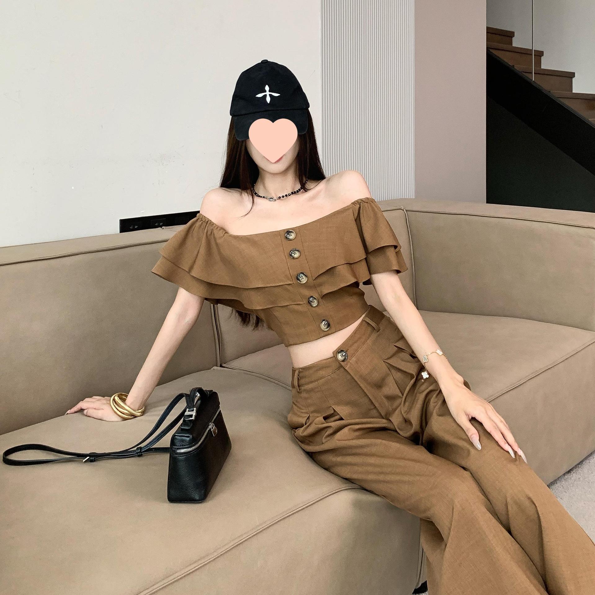 韩系一字肩荷叶边上衣显瘦修身阔腿直筒裤女夏季新款气质时尚套装