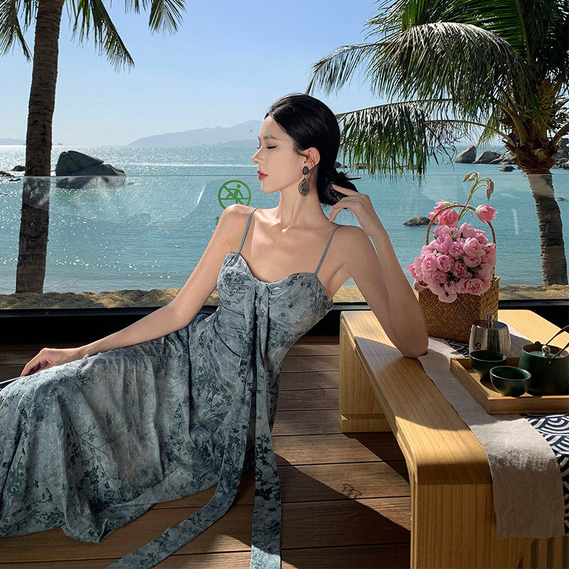 新中式清冷感扎染水墨蓝色吊带连衣裙气质显白国风文艺风