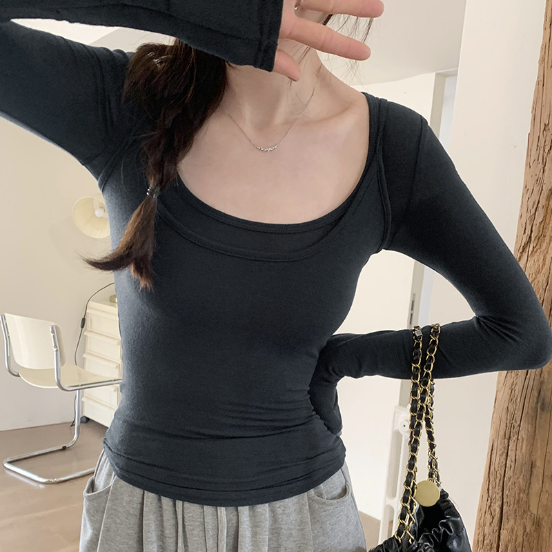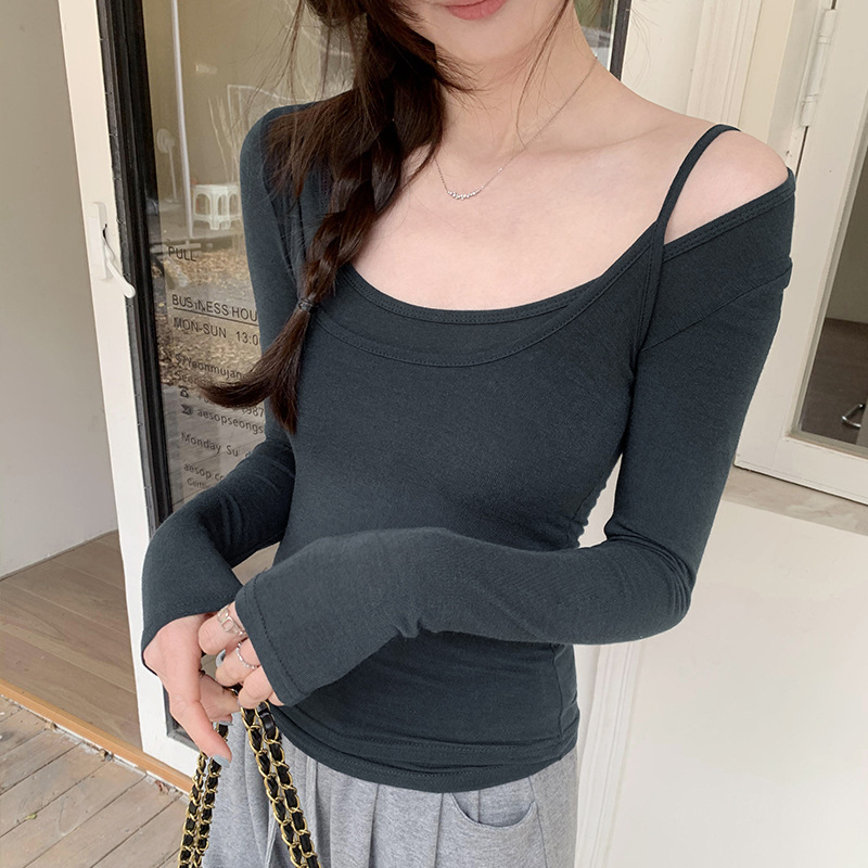 修身辣妹正肩长袖T恤女春秋新款吊带背心两件套百搭打底上衣